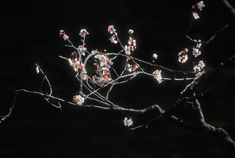 空の深淵から切り取られたかのような冴え冴えとした群青のキャンバスに、冬の吐息が結晶化した白梅が凛と浮かび上がっている。冷たく澄み切った早春の気配が支配する空間…