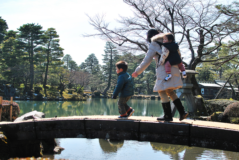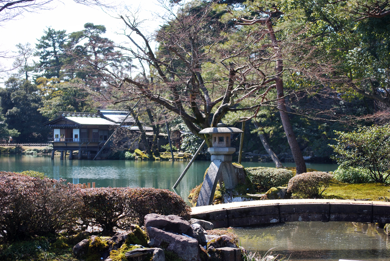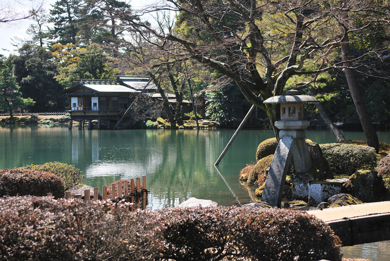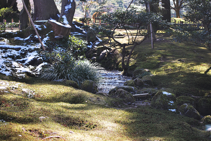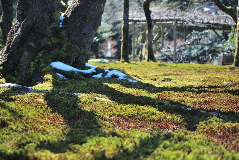 三月初旬、兼六園を包む空気は、冷たさとかすかな湿り気を帯びながら、春の足音をほのめかしている。太くごつごつとした古木の根元には、別れを惜しむかのように雪が薄化粧を施し、雪解け水は眼下に広がる広大な苔の絨毯へと静かににじみこんででゆく。苔は冬の深い緑から、日の当たる部分では鮮やかな若草色、影に隠れた部分では赤褐色の落ち着いたトーンへと、緻密なグラデーションを織り成し、大地を覆う生きている芸術作品となっている。早春の斜陽は苔庭の上に長く鋭い影を投げかけ、漆黒の筆跡のように庭の静寂を強調する。光と影の劇的なる対比が兼六園の深遠なる美を際立たせるのだ。木立の奥には冬の衣を脱ぎ始めた木組みの東屋が静かにたたずみ、やがて来る賑わいを待っているかのようだ。全ての情景がまだ完全に目覚めていない、深く穏やかな沈黙の中にありながら、兼六園の悠久の時と雪の下で培われた生命の力強さを、訪れる者に静かに語りかけている。北陸の厳しい季節を乗り越えた者だけが持つ、はかなくもおごそかな、早春の希望に満ちた瞬間である。