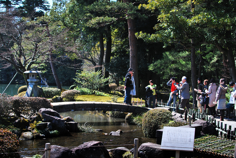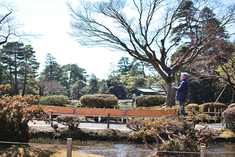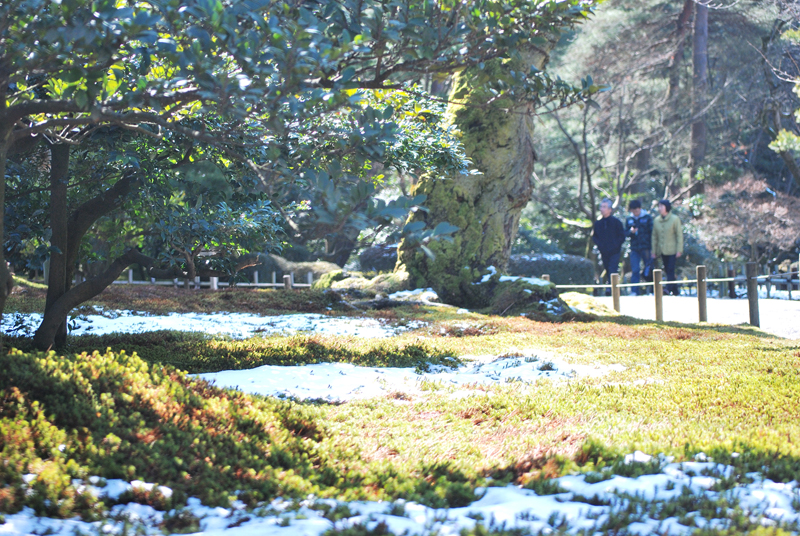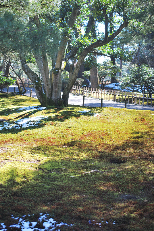 三月初旬、兼六園。早春のまばゆい光が、大地に広がる命の絨毯を鮮やかに照らし出す。手前に広がる苔庭は深く豊かな緑色と寒さの名残を留めた赤褐色のトーンが混じり合い、雪解けによって生まれた白く輝く水たまりのように、まだらな雪を抱きこんでいる。苔の一枚一枚、一株一株が、太陽の恩恵を受けて力強く息を吹き返し、まさに季節の変わり目を告げるみずみずしい生命の躍動を感じさせる。左手前の常緑樹は分厚い葉を茂らせて、光の中に深遠な影を落とし、冬を越した変わらぬ静けさと威厳を保っている。視線の先、庭の奥には、苔をまとい威風堂々とした老木が、長い歴史の証人として太い幹を天に伸ばしている。足元、竹の柵の向こう側の遊歩道には、冬の終わりと春の気配を感じながら、二、三人の人影が穏やかに散策している姿が見える。彼らの慎重な足取りは、この名園の静謐を尊重し、風景に溶けこんでいる。全てがまだ目覚めきらない静寂の中、光と雪と緑のコントラストが、北陸の古都に訪れたはかない、希望に満ちた早春の瞬間を、絵画のように閉じこめているのだ。梅林では紅白の梅が綻び始め、曲水の縁ではショウジョウバカマが咲き出す頃。この庭は、これから本格的に始まる春爛漫への序章を、優しく、力強く奏でている。