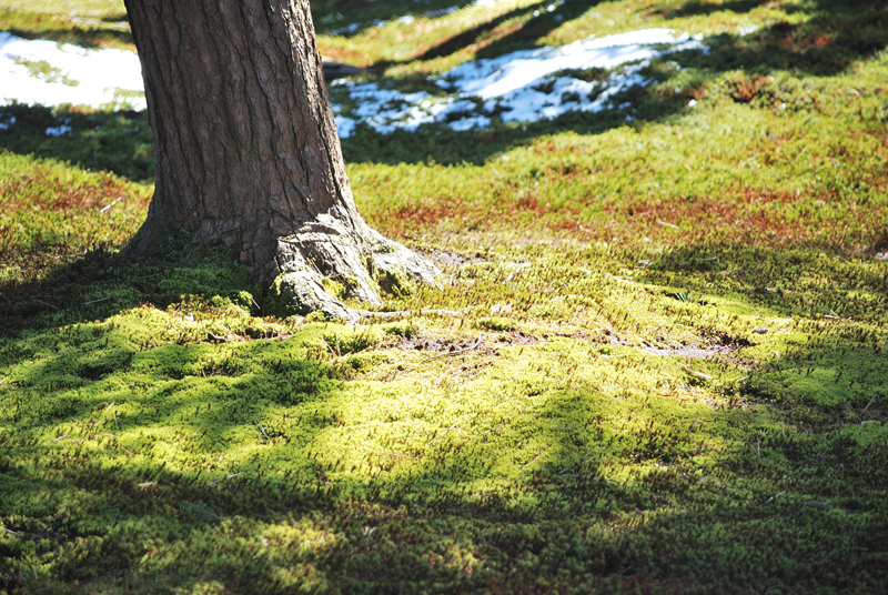 三月初旬の兼六園、極微の世界に宿る早春の息吹。地面をはう苔は、一株一株が星型の小さな絨毯のように密生し、冬の寒さに鍛えられた赤茶けた茎の上に、新鮮な緑の先端を掲げている。大地に敷き詰められた無数の小さな針葉樹林のようだ。画面の左半分を占めるのは、名残惜しむように残された霜柱の名残を溶かし始めた雪。その雪のフチは、陽光に透けて氷砂糖のようにキラキラと輝き、冷たい白さと、苔の持つ生命の温かい緑色とが、一筋の不規則な境界線で劇的に分断されている。雪の奥底からは、解け始めた水分が苔へとしみこみ、新たな生を呼び覚ます生命の恵みとなっている。この雪と苔が織りなす二色の紋様は、過ぎゆく冬と訪れつつある春、静寂と目覚め、白と緑という対極の美を、掌サイズの世界に凝縮している。