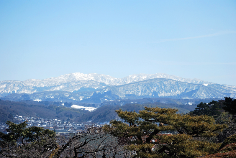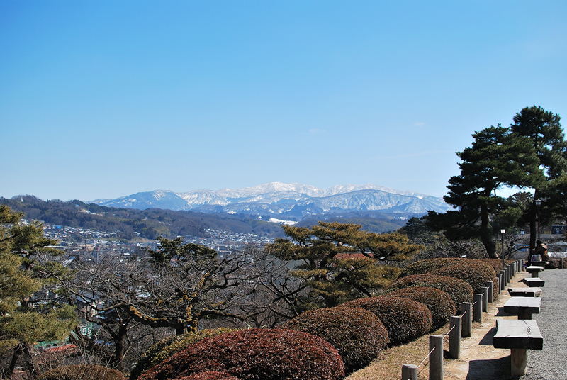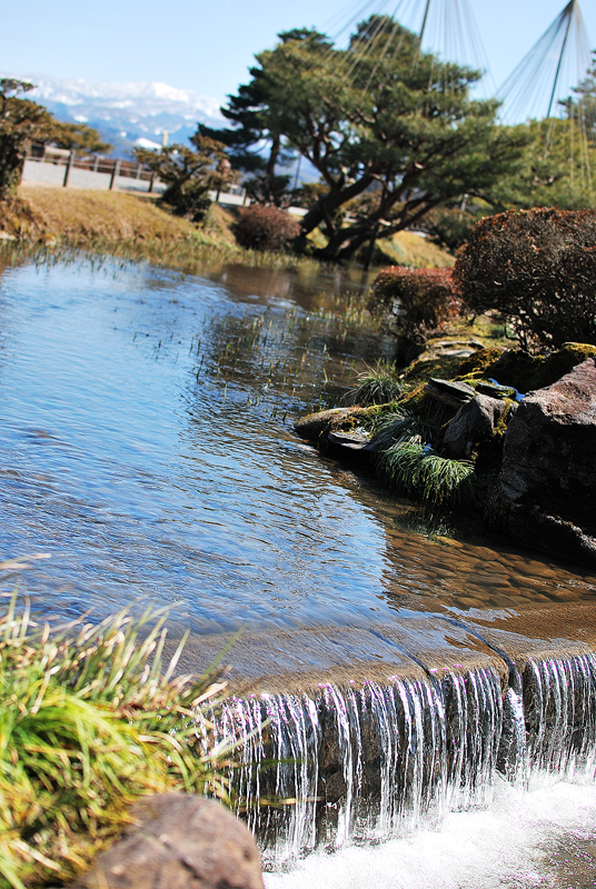 三月初旬、兼六園。早春のまばゆい光が、園内最大の霞ヶ池の水面に降り注ぐ景観である。空は青く澄み渡り、池の水は深く、揺らめく水面のさざ波が、光を細かく砕き、生きた青玉のように輝いている。手前に焦点を結ぶのは、池の水が低い方へと流れ落ちる小さな曲水であり、水は透明などんちょうのように垂れ、砕けて白く泡立ち、清冽な音を立てている。水際に生える若草は、冬を乗り越えた強さを秘め、光を受けて鮮やかに立ち上がっている。水底の石や砂利は、水の清らかさゆえにその姿を露わにし、庭園の計算された自然美を雄弁に物語る。視線を上げれば、後景には雪吊りを施された老松が威風堂々と枝を広げ、向こう側、遥か遠景には、白い雪を戴いた白山山系の峰々が、青空の下に淡く、確固として浮かび上がっている。この雄大な眺望こそ、兼六園が持つ眺望の真髄であり、近景の雅と遠景の荘厳が見事に調和する瞬間である。水音と光と雪山の対比は、兼六園が単なる庭園ではなく、悠久の自然と人の創造性が一体となった芸術作品であることを証明しているのである。水は動き、光は輝き、松は立ち、山は遠大なり。全てが希望に満ちた静かな躍動。