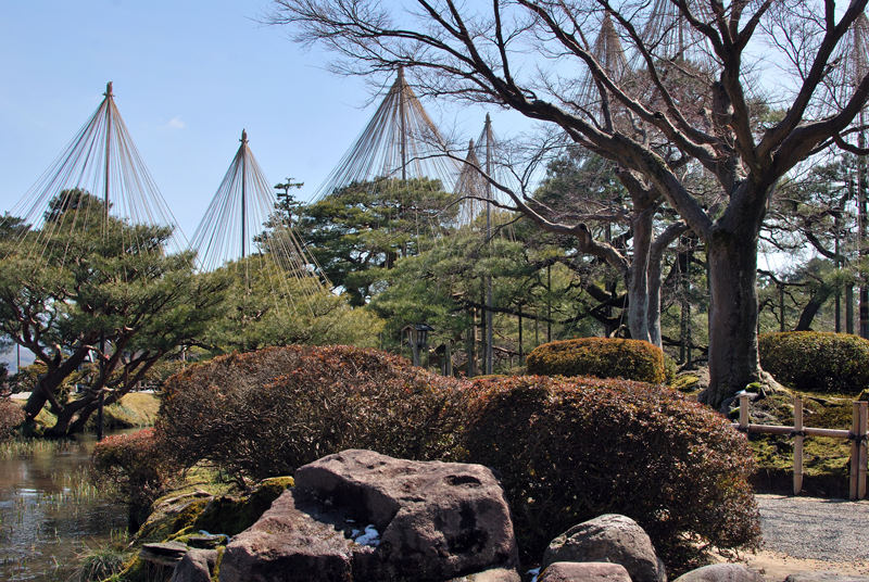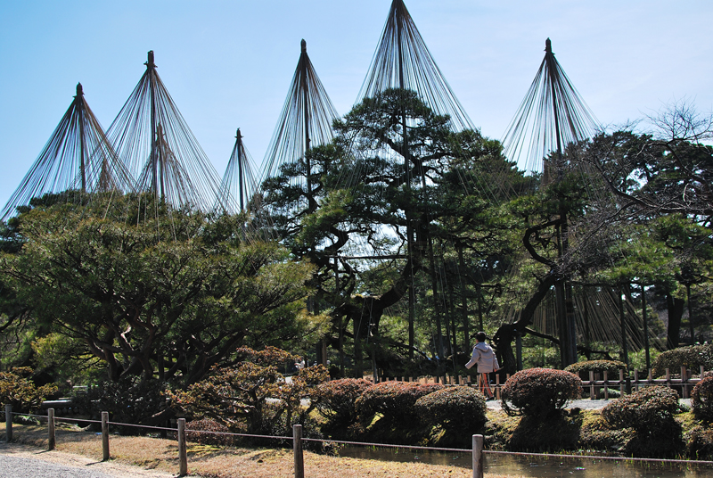 三月初旬、兼六園。天は深く澄み、清冽なる早春の光が庭園に満ち渡る。凍てつく季節を乗り越えた大地は、生命の鼓動をひそかに響かせている。視界を支配するのは、北陸の風雪にあらがった偉大なる造形、雪吊りのシルエットである。縄は天を指し、幾重にも重なりて張られ、巨大な松の木々を神へと捧げる祈りの尖塔を成している。その姿は冬の終焉を告げつつも、悠久の時を生きる古木の威厳を一層引き立てる。足元の苔庭は、雪解けの水分を吸い込み、深緑と赤褐色の織物として光の中で輝き、小さな命の目覚めを告げる。苔の一星、一星が、太陽の恩恵を受け、春への息吹を力強く放っているのである。雪吊りが外される日を待つ、この静謐にして劇的な情景は、自然の力強さと、人の手による雅の極致が最も調和する、希望に満ちた一幕である。兼六園の早春は、静かに、力強く、再生の詩を奏でているのである。
