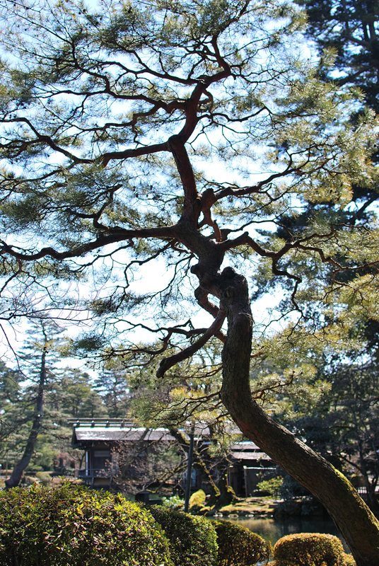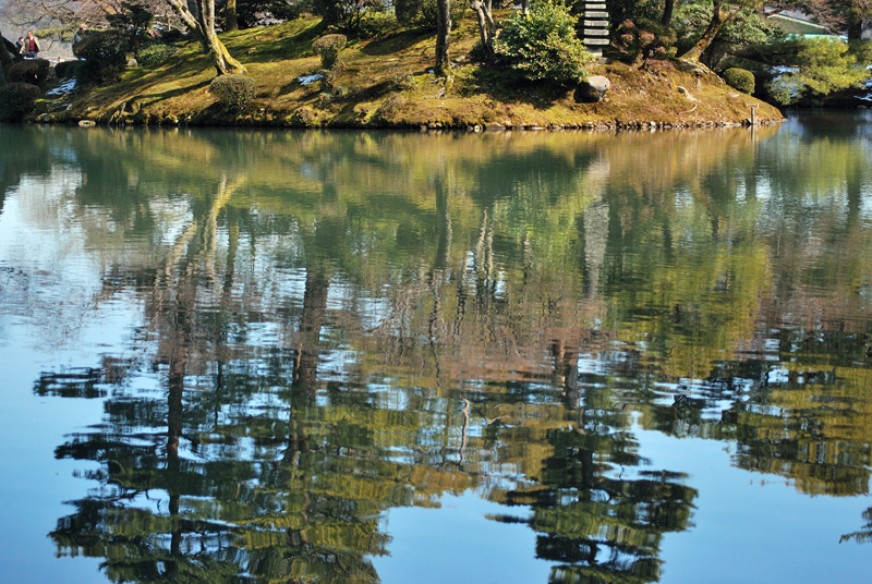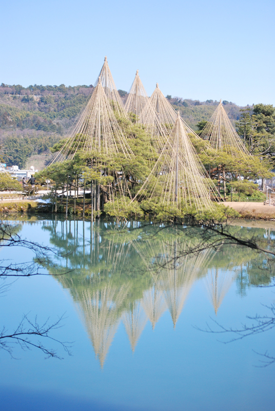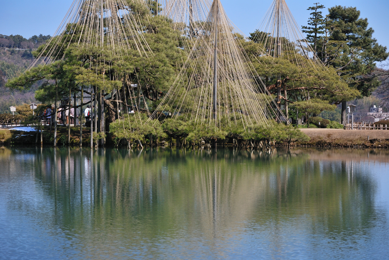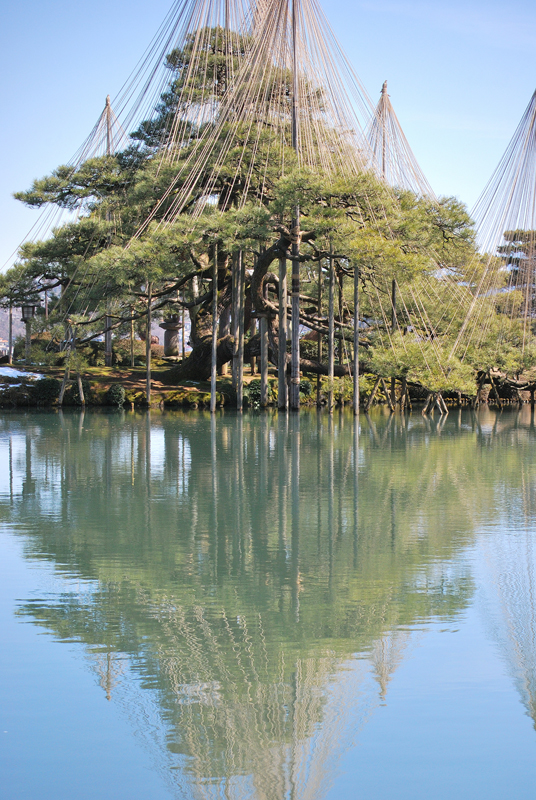 三月初旬の兼六園は、冬と春がゆっくりと重なり合う刹那の風景である。池はまだ冬の冷たさを残しながらも、春の光を受け止めて静かにきらめき、水面には雪吊りの縄をまとった松が深く映りこんでいる。縄は空へ向かって放射状に伸び、季節を支える細い祈りの糸のように一本一本が張り詰めているが、緊張を溶かすように柔らかな陽射しが降り注ぎ、縄の影が水面で揺れるたびに、冬の気配がほどけていく。古木の松は幹をゆるやかに曲げ、長い年月の風雪を受け止めてきた重みを静かに抱えながら、春の訪れを確かめるように淡い光を浴びている。木肌にはまだ冷たい空気がまつわりついているが、奥にはほのかな温もりが宿り、季節の境界が内側からゆっくりと動き始めているのが分かる。庭園のあちこちでは、雪が消えた土からかすかな匂いが立ち上り、梅の蕾はほんの少しだけ紅を差し、鳥たちはまだ遠慮がちに季節の変化を告げている。風は依然として冬の名残を運んで頬を刺すが、その冷たさの奥に、近い未来の柔らかさがかすかに紛れこんでいる。兼六園に立つと、季節は突然訪れるものではなく、こうして静かに、深呼吸するように移ろっていくのだと気づかされる。冬が軽く身じろぎし、春がそっと姿を現す、その境目の時間を、兼六園は水面と松と縄によって美しく刻んでいるのである。