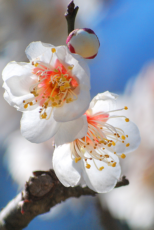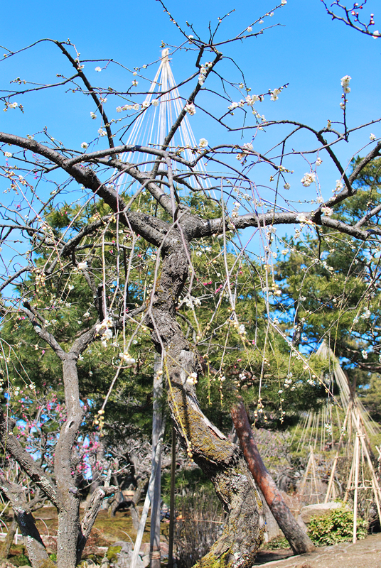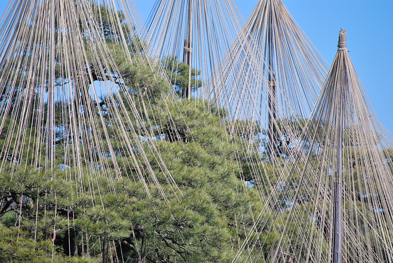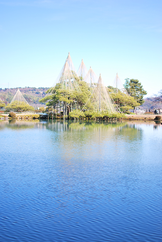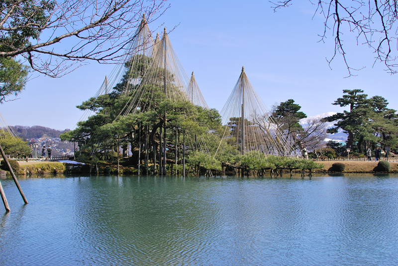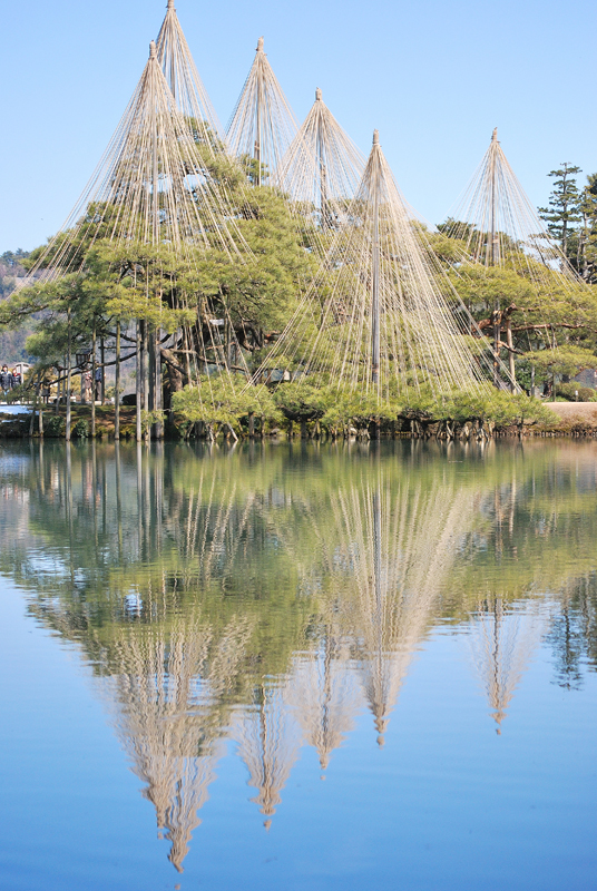 三月初旬、冬の厳しさが名残惜しそうに指先にまとわりつく北陸の空は、吸いこまれるように深く澄んだ碧色をたたえ、天蓋へ向かって凛と伸びる無数の縄たちは、金沢の空気を織り上げる巨大な竪琴の弦のごとく張り詰められている。幾多の降雪という冬の重みから老松の枝を守り抜いてきた雪吊りの幾何学模様は、円錐の頂点から放射状に降り注ぐ春の陽光を浴びて黄金色の輝きを放ち、来るべき季節の到来を告げる静かなるファンファーレを奏でているかのようである。足元に広がる霞ヶ池の水面は、柔らかな風に撫でられてかすかに揺れながらも、頭上の空の青と松の緑、雪吊りの優美な三角錐を鏡のように映し出し、現実と水鏡という二つの世界を溶け合わせ、どこまでも続く深淵な奥行きを創り出している。まだ枯れ色の残る芝生や木々の梢には、かすかに芽吹き始めた生命の温もりが滲み出し、春を待ちわびる木々の吐息と、雪解け水の清らかな匂いが混じり合う園内には、静寂の中に確かなる鼓動が満ちている。灯籠が静かに時を見守り、曲水がさらさらと歌うその傍らで、冬枯れの景色の中に一点の朱を差すように咲き始めた梅の花が、ほのかな香りを漂わせているのもまた、季節の移ろいを雄弁に語る一節である。厳しい冬を越えた松の緑はいっそう深みを増し、やがて来る桜の季節への序章として、この庭園は今、冬の静謐と春の躍動が奇跡的な均衡を保つ、一年で最も繊細で美しい刹那を刻んでいるのである。