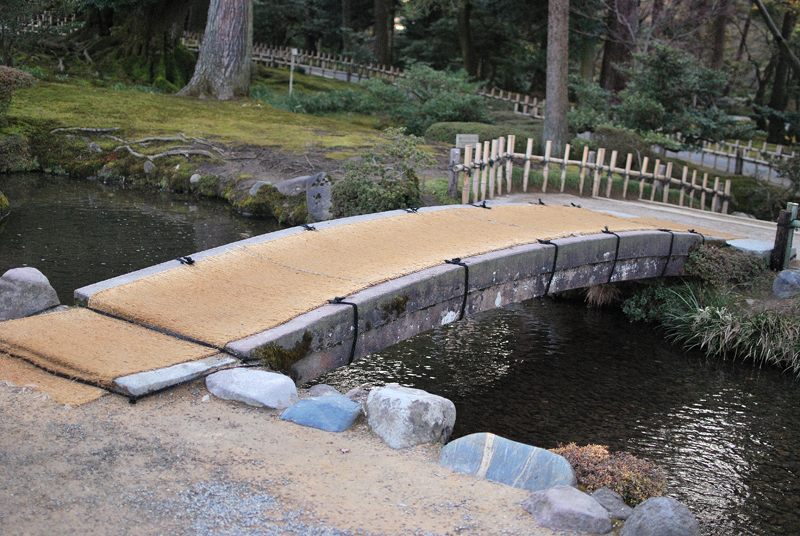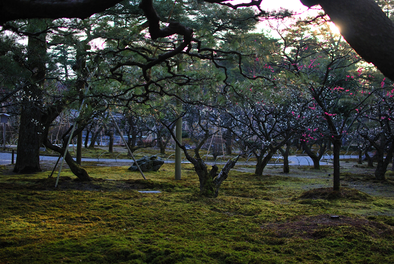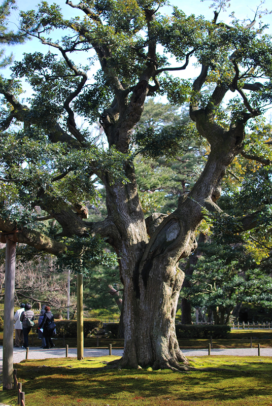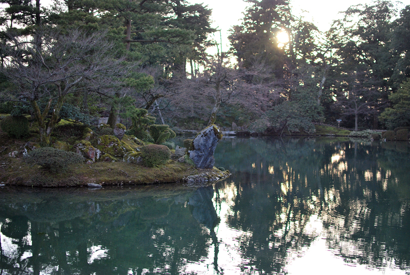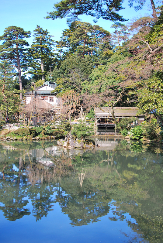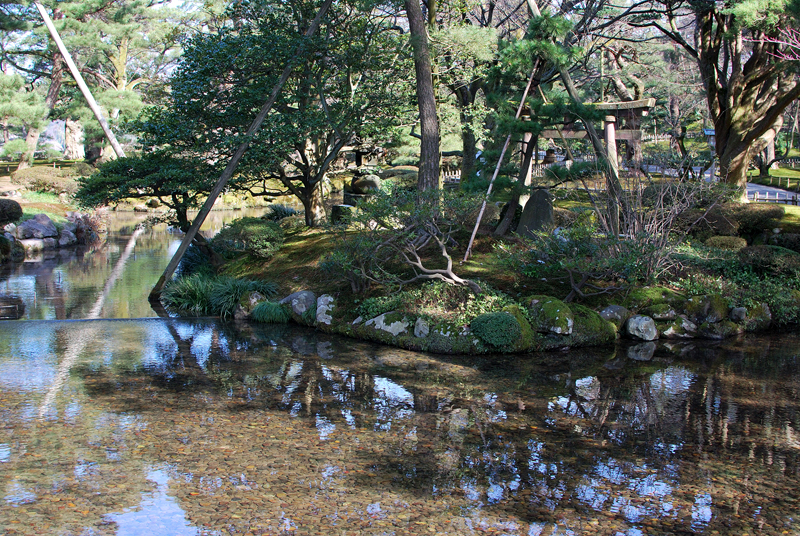 三月初旬、兼六園は静謐なまどろみに包まれる。金沢の空は淡く、池の水面は鏡のごとく穏やかで、底に沈む枯れ葉メノウ色の小石を映し出す。水は透明で、そよぐ風にかすかに波紋が広がり、岸辺の木々の影をゆらゆらと揺らす。巨岩を抱く老木の下、緑の苔は雫を飲み干しみずみずしい光沢を取り戻しつつある。深い緑は変わらぬ時の流れを語りかける。椿はぽつりぽつりと紅を点し、梅の古木は固い蕾に春の気配を閉じこめる。やがて枝を覆い尽くす桜のはかない夢は、今はまだ幹の中でそっと息を潜めている。雪に耐え、緑を深めたる松の影、清き水面に春の兆しを映す。この広大な庭園は、今、冬の眠りから覚めかける、悠久の美が満ちる時を迎えている。かすかに湿った空気の底には、土の匂いと混ざり合い、梅のほころびを思わせる、清らかでほのかな甘い香りが漂い始めている。