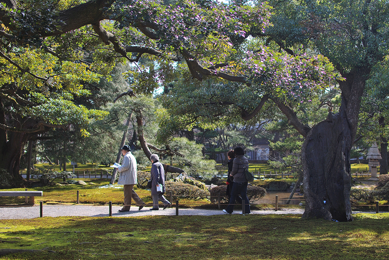 三月初旬、兼六園の広大な敷地に、春を待つ静謐な陽光がまばゆく降り注いでいる。光は太く黒くねじれた古木の風格ある幹を照らし、枝先にかすかに宿る紫がかった新芽の気配を浮き彫りにしている。足元に広がる苔の絨毯は、冬の寒さを潜り抜けた濃い緑を深くたたえ、生命の息吹を光の粒としてきらめかせている。茶褐色の園路には、穏やかな散策を楽しむ人々の影が、季節の変わり目の庭園を静かに踏みしめている。地図を広げる者、風景に目を凝らす者、彼らのゆったりとした歩調は、この庭園に流れるゆるやかな時の流れそのものであり、奥に連なる松や常緑樹の力強い緑が、冬から春へと移りゆく生命のグラデーションを作り出している。全てが静けさの中にありながら、苔の湿潤さ、木々の重厚さ、人々の静かな往来が、まもなく訪れる華やかなる季節の序曲を、奥ゆかしく奏でている情景である。兼六園で、人々は春になる。