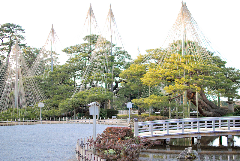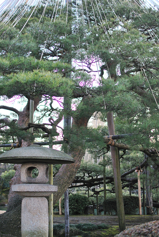 天高く、冬の名残。空に向かって放射状に伸びる、幾筋もの細い縄。冬の積雪から樹々を守るための雪吊りの、まさに最盛期を過ぎたばかりの姿。三月初旬、多くの縄は解かれ、主役の座を降りようとしているが、この古木だけは、いまだ天蓋のように荘厳な装いを保っている。空は淡い光を帯び、どこか寂しげな霞んだ色合いをまとい、季節の移ろいを静かに告げている。緑の松、命の曲。中央にそびえ立つは、時を超えて生きる黒松。その幹は大地に根を張り、幾度もの冬を耐え抜いた証として、大きく曲がり、たくましい曲線を描いている。濃い緑の葉は、天からの光を吸いこみ、冬枯れの景色の中で鮮烈な生命の色を放つ。縄の直線的な美と、松の有機的で雄大な曲線が対比し、日本の伝統的な造形の美を極めている。たたずむ燈籠、静寂の象徴。手前には古びた石燈籠が苔むした台座の上に静かにたたずんでいる。円い火袋には静かな時を閉じ込めたかのように、小さな窓が開いている。燈籠は、過去から現在へと、変わらず庭を見守り続ける静寂の象徴。古木の力強さとは対照的に、庭園の精神的な深みを表現している。地面に広がる静けさ。足元は、低く刈りこまれた常緑樹や、苔に覆われた土が見え、穏やかな静けさに満ちている。春の訪れは間近でありながら、まだ寒さが残るこの季節、庭園全体が、深い呼吸をしているかのような、厳かな美しさをたたえている。この兼六園の情景は、伝統と生命力、静謐な時の流れが凝縮された、一枚の詩のような風景だ。