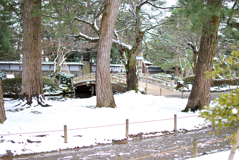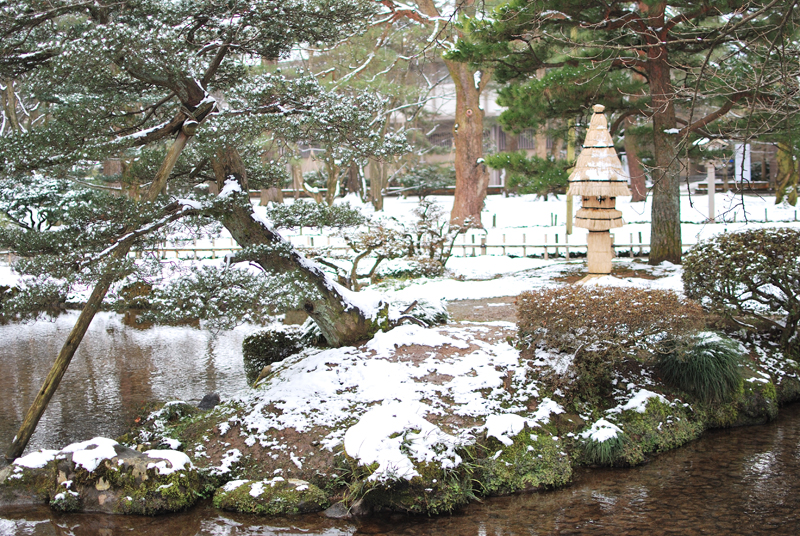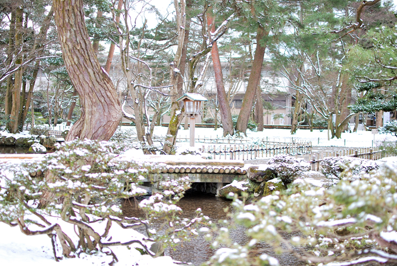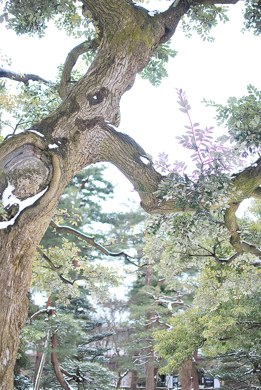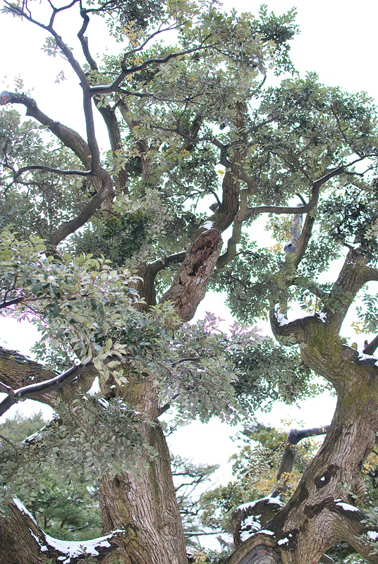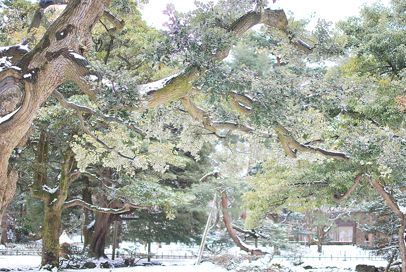この兼六園の雪景色の主役は、重力に逆らうように伸びた枝の力強い曲線であり、天空へと向かう龍の爪痕のようである。老木の太い枝は、わずかに積もった雪をその肌にまといながら、冬の淡い光の下で、白と緑の複雑な綾を織りなしている。葉には雪が残り、常緑樹の確かな生命力が、寒さの中に静かに息づいていることが伝わる。下方に目をやれば、地面は均一な白で覆われ、庭園全体が水墨画のような幽玄な空間へと変貌している。枝の影と雪の白、常緑の葉が奏でるコントラストは、凍てつく季節にあってなお、兼六園が持つ生命の深さと、洗練された庭園美を雄弁に物語る。その風景は、日本の冬が持つ、厳しさの中の静かな美しさ、耐え忍ぶ生命の強さを映し出している。