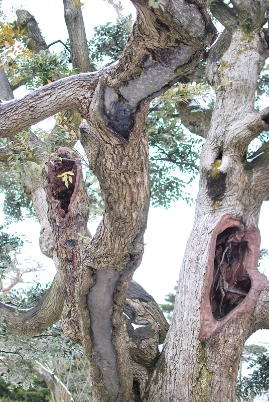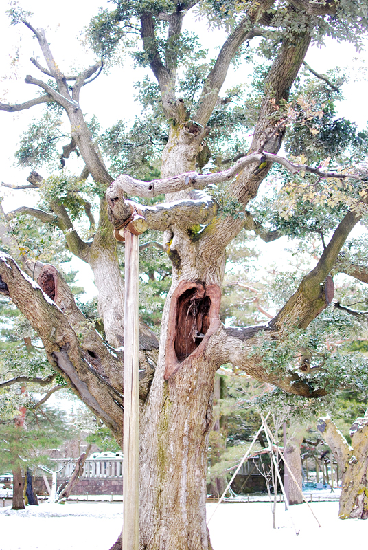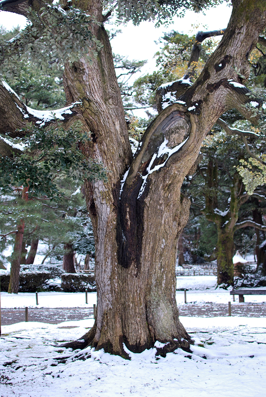 白銀に閉ざされた兼六園の静寂の底、そこにあるのは時を超えた古木の魂である。樹齢幾星霜を重ねた幹は、荒々しくも威厳に満ち、その深く大きな洞は、庭園の永き記憶を秘めた静かな祠のようだ。雪は音もなく大地を覆い、すべての喧騒を吸い込み、世界は淡い水墨画の境地に至る。枝々には純粋な白さが宿り、厳しい冬の試練を耐え忍ぶのではなく、むしろそれを装いとして受け入れている。老木の傍らに立つ常緑樹の濃い緑が、無彩色の風景に深遠な生命の色を添え、雪吊りの縄は、自然と人との間で結ばれた静かな約束を物語る。古木のたたずまいは、春の胎動を深く秘め、日本の「侘び」「寂び」の美意識が、最も清らかに、そして力強く結晶した冬の詩情そのものである。
