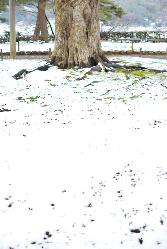 雪に覆われた大地から、老木が力強く立ち上がる一瞬を捉えたこの兼六園の光景は、静かなる生命の戦いを物語る。画面の大半を占める純白の雪は、わずかに土の粒子を混ぜながら、極限の静寂を保つ。その広大な白の奥に、時の重みを刻んだ太い幹の基部がそびえ立ち、大地をつかむように張り巡らされた根は、厳しい寒さの中でも揺るがぬ命の決意を示す。幹の際、雪に覆われきれなかった苔の緑が、かすかな抵抗の色として残り、白と茶の厳格なコントラストの中に、生きている証を刻んでいる。垂直に伸びる幹の強大さと、それを支える地表に広がる根の複雑な造形は、冬の兼六園の底力と、すべてを包み込む自然の厳粛な美しさを深く印象づける。