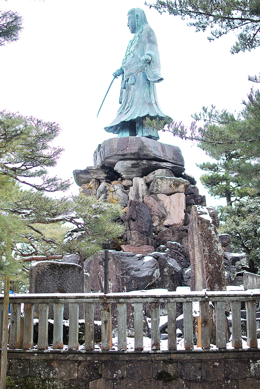 雪の兼六園、白く凍てついた空を背に、岩山の頂に日本武尊の銅像が凛として立つ。緑青を帯びた姿は、遥かな神話の時代から現代へと時を超えて現れたかのような威厳を放つ。手にする剣は、今もなお邪を払うかのように天を差し、流れる衣の裾は、風雪を凌駕する不屈の精神を象徴している。足元の土台は、自然の力強さを物語る荒々しい岩塊が積み上げられ、その上に立つ尊の姿を一層高く、神聖なものとしている。低い位置にある石の柵は、見る者と神像との間に清らかな境界を引き、この冬の静寂の中で、歴史と英雄の魂が庭園の厳粛な美と調和している。この像は、兼六園という憩いの場にあって、国の始まりの勇気と、尽きることのない精神の力を静かに問いかけている。