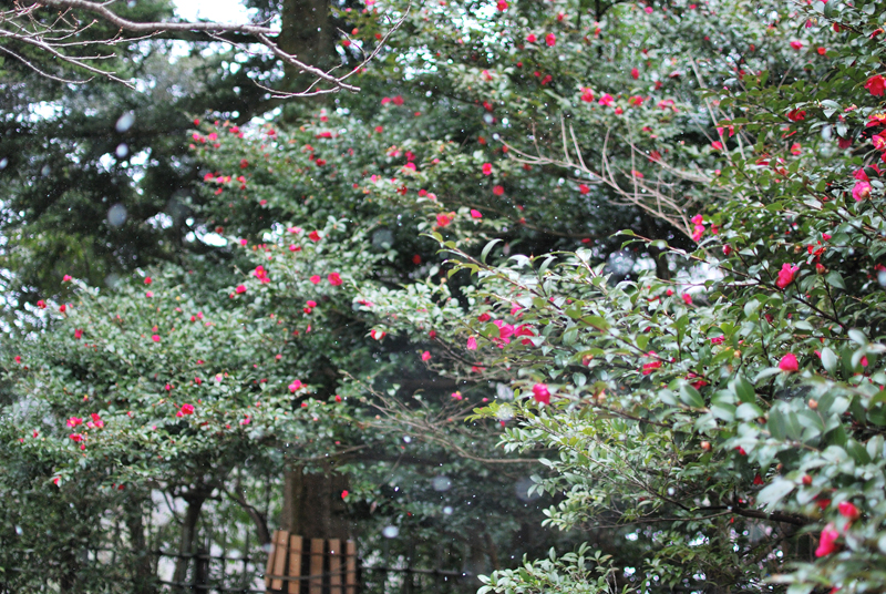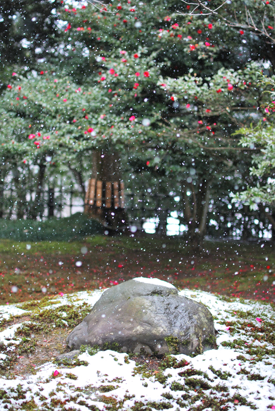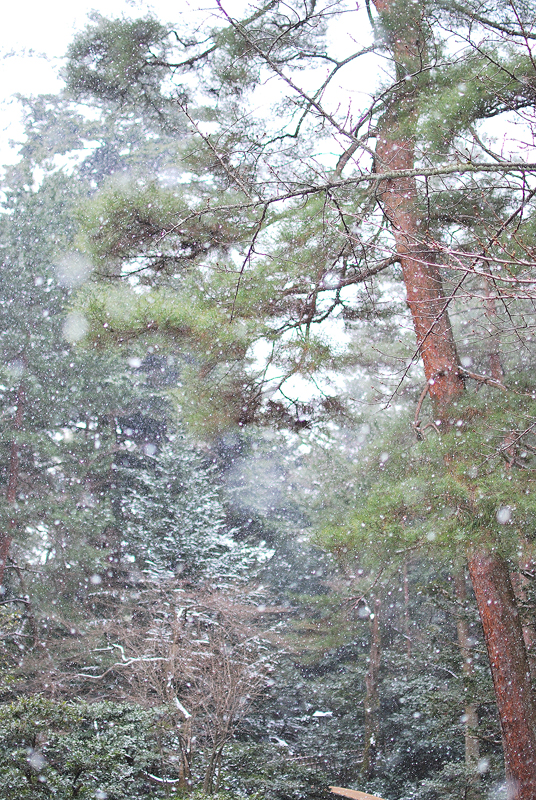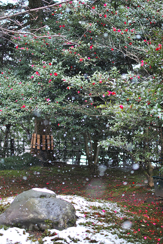 しんしんと雪が舞い続ける三月初旬の兼六園。冬の名残と春の息吹が交錯するこの庭園は、静寂と鮮烈な色彩の対比に満ちている。背の高い常緑樹の濃い葉群の中では、深紅の椿が、雪の白さと寒さに負けずに無数の花を咲かせ、この静寂な空間に情熱的な命の色を放っている。椿の花びらは降り積もる雪に混じりながら、苔生した大地の上に薄く散り敷かれ、雪の白、苔の緑、花びらの赤が織りなす錦の絨毯となっている。手前の大きな岩にはわずかな雪が積もり、濡れた肌は鈍い光を反射している。奥の木々には保護のための雪吊りの名残が見え、降り続く淡雪は、光を捉えて煌めく無数の粒子となり、庭園全体を幻想的なヴェールで覆い尽くす。