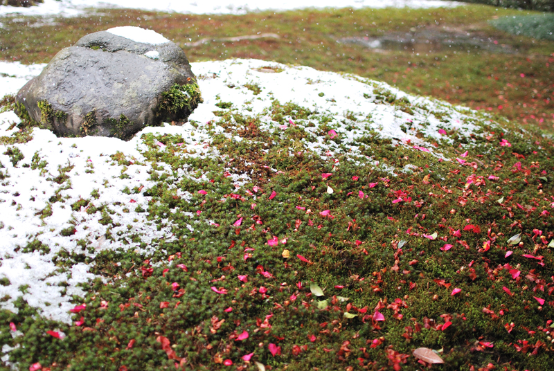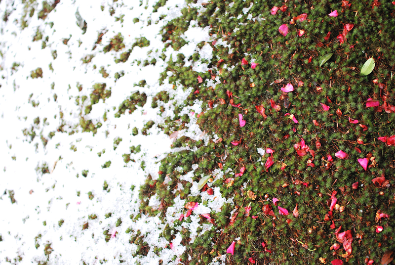 苔の丘に降り積もった雪は白い衣のように一部を覆い尽くし、冷たさの中で生命力に満ちた深緑の苔が広大な絨毯を敷いている。苔の上に、散り落ちたばかりの鮮烈な椿の緋色の花びらが点々と散乱し、雪の白さと苔の緑の間に、はかなくも情熱的な色彩を添えている。丘の頂には、苔に縁取られた黒い岩が堂々と鎮座し、その平らな面にはわずかな雪が残り、自然の厳しさと静けさを物語る。三月の冷気の中、雪、苔、岩、散り敷かれた椿の花びらが織りなす景色。時の流れと移ろう季節。