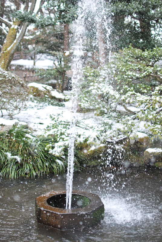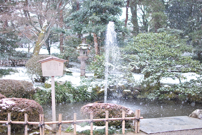 雪の結晶が空から舞い降りる中、兼六園の池に設けられた日本最古の噴水が、冷たい水柱を天に向かってまっすぐに突き上げている。その水は周囲の静寂を打ち破る唯一の躍動であり、絶え間なく続く水の生命が、凍てつく冬の景色に温かな脈動を与えている。水しぶきは微細な霧となって漂い、雪と混じり合って光を捉え、幻想的な輝きを放っている。噴水の周りの池の縁には、丸みを帯びた植えこみが雪をいただき、古びた石灯籠は雪化粧を施され、この庭園の悠久の時を静かに物語っている。遥か奥に広がる木立も雪に覆われ、すべての色彩が抑えられた中で、水が弾ける音だけが響き渡り、この歴史的な名園の厳粛な冬の美しさを際立たせている。