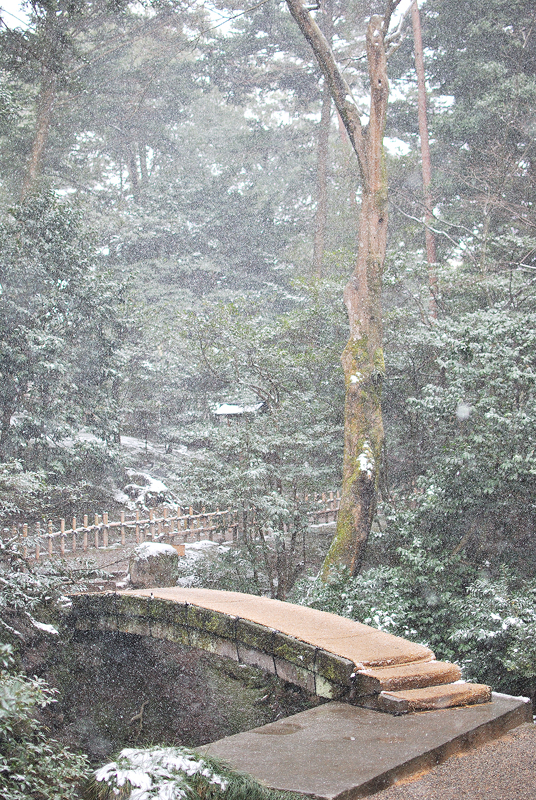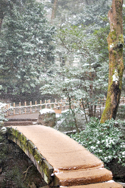 雪が降りしきる中、古びた石橋が深い森の入口へと静かに架かっている。橋の表面は苔むし、長い時の流れを感じさせる深い色合いを帯びていて、降り積もった雪が縁にわずかな白を添えている。橋の先は、竹垣に沿ってうっそうとした木々の中へと続き、視界いっぱいに広がる常緑樹の葉や枝にも薄く雪が積もり、すべてが静寂に包まれた水墨画のような世界を創り出している。景色の中一本の背の高い古木が苔生した幹を露わにして立ち、庭園の歴史を見守るかのような厳かな存在感を放っている。絶え間なく舞い落ちる雪の粒は、空気中に無数の光の点となり、深遠な景色を幻想的に染め上げている。橋の下には深い陰影が広がり、静けさが、この雪に閉ざされた空間の詩情を一層深めている。