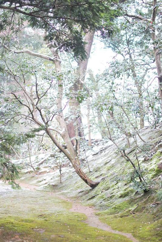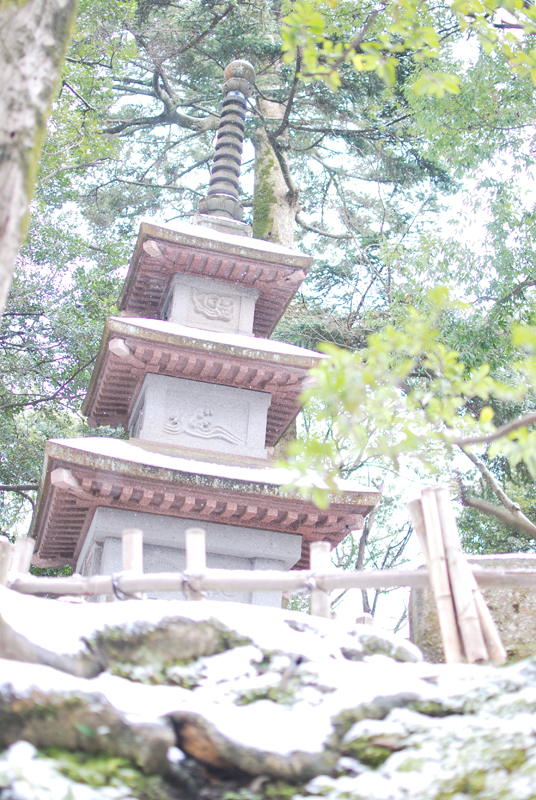 苔と雪に覆われた小高い土手の上に、幾層にも重なる石造りの塔が、雪化粧をまといながら静かにたたずんでいる。石の肌には長い年月を経て風化が進み、施された彫刻や複雑な屋根の意匠が、庭園の深い歴史を物語っている。塔の周囲は、枝葉がまばらな落葉樹と常緑樹に囲まれ、冬枯れの空を背景にして、その威厳ある姿を際立たせている。足元には、竹で組まれた簡素な柵が聖域を守るようにひっそりと続き、わずかに積もった雪が、地面を白い線で縁取っている。前景の木の根元には雪と苔の緑が混在し、生命の営みが、荘厳な石塔の静かな存在感を一層引き立てている。光の加減が柔らかく、歴史的な塔の立つ空間全体が、穏やかで神聖な雰囲気に満ちている。