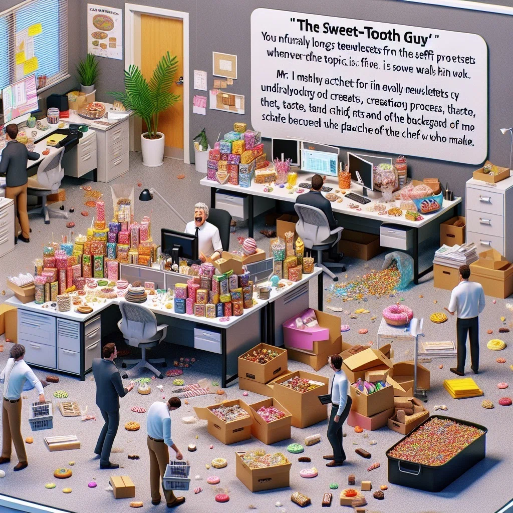 彼の机はいつもスイーツの山になっていた。色とりどりのパッケージ、あふれかえる焼き菓子の甘い香り。たまに賞味期限切れの物もあり、周囲にお菓子のクズや包装が転がり、彼の席の床のカーペットだけ黒く、汚い。彼の周りのみんなは集中力を奪われていたけど、気前よくお菓子を配ってくれるので人によってはありがたく思っていたようだ。