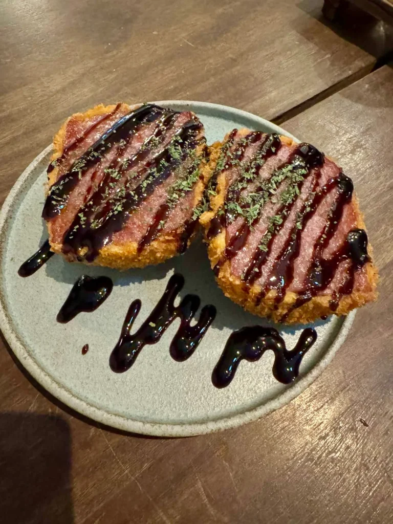 驚いたのはハムカツですね。写真ですとわからないかもしれませんが、とても大きかったです。他に塩辛も美味しかったです。