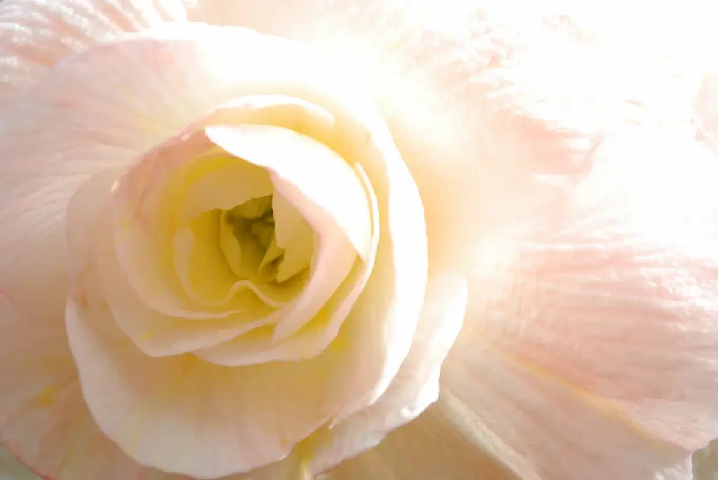柔らかな光に抱かれ、白きベゴニアは息づく。透き通る羽根を広げ、光をまとい、バター色の渦、内なる花びらは静かに眠る。神秘の螺旋は、秘密を優しく抱きしめる。絹の衣を纏い、光を透かす花びら。繊細な線、儚き皺、命の物語を刻む。静寂の中、囁くように光放ち、純粋無垢な輝きが、世界を優しく染める。霞む世界に浮かぶ、白き妖精の舞。触れれば消えゆく、儚き夢の煌めき。永遠に閉じ込められた、美の瞬間。時を忘れ、ただ見つめる、その静謐な姿。内なる光が、柔らかく花びらを照らし出し、静寂の調べが、空気を優しく震わせる。白きベゴニアは、静かに語りかける。命の尊さ、美しさ、永遠の輝きを。
