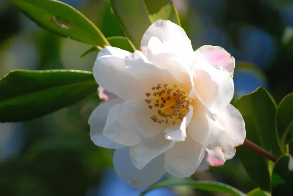 光に満ちた白いつばき、玉虫色の光で柔らかく輝き、優しいキスで日の光を浴びる。デリケートな花びらは柔らかく広がり、金の玉虫色の心は、無数の花粉の斑点を示す。つややかな緑の葉は背景を飾り、生命と成長の物語をささやく。静かな優雅さがその姿に宿り、自然の芸術性が、自然の華麗なデザインを披露する。