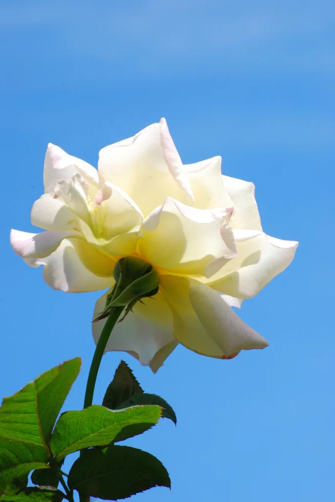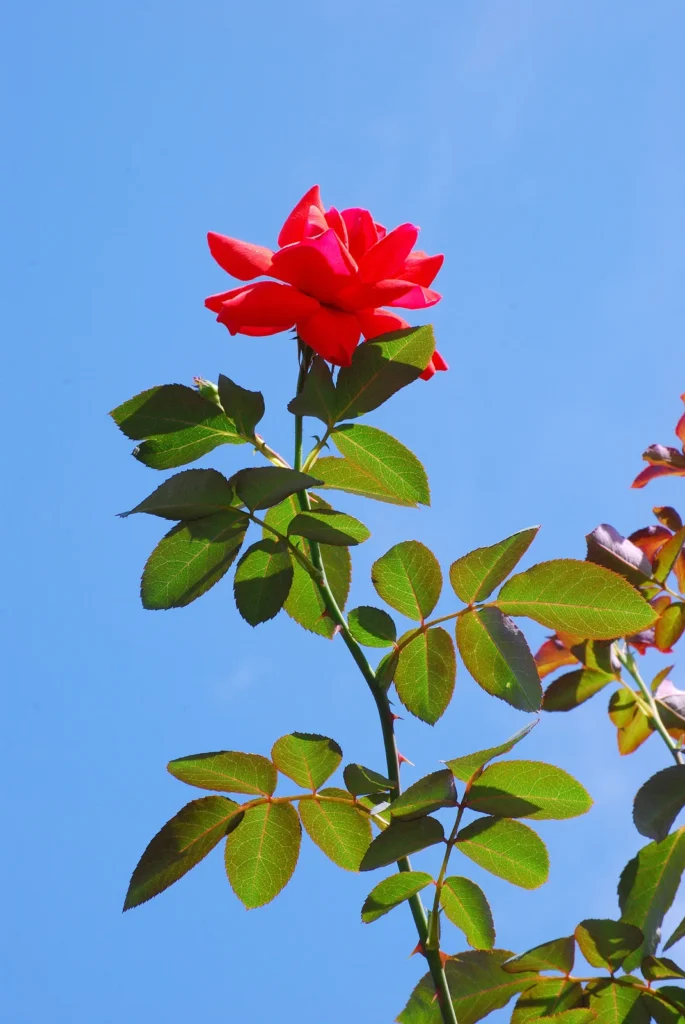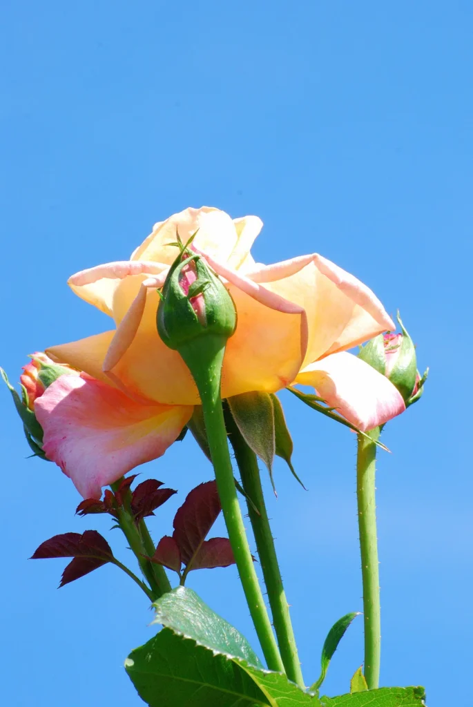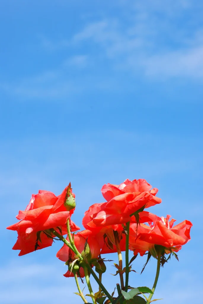 春の陽光が降り注ぐバラ園は、色とりどりの花々が咲き誇る。空はどこまでも高く澄み渡り、爽やかな風が頬を撫でる。柔らかな土の香りと、バラの甘い香りが混ざり合い、うっとりとするような空気があたりを包み込んでいる。一面に広がる紅色のバラの絨毯。その鮮やかさは、燃える炎のよう。一つ一つの花は、春の訪れを祝うかのように、精一杯に花びらを開いている。濃い紅色の花びらは、ベルベットのような質感で、光を受けて艶やかに輝いている。近くで見ると、その複雑な構造に驚く。幾重にも重なった花びらは、一枚一枚が微妙に形を変え、中心に向かって渦を巻くように配置されている。紅色のバラ以外にも、様々な色のバラが咲き乱れている。淡いピンク色のバラは、初々しい少女のような可憐さを漂わせ、純白のバラは、気高く神聖な雰囲気を醸し出す。黄色やオレンジ色のバラは、春の太陽のように明るく、見る者の心を温かく照らしてくれる。色とりどりのバラが咲き誇り、甘い香りが辺り一面に漂っている。恋人同士が手を取り合って歩く姿や、子供たちが笑顔で走り回る姿も見える。春のバラ園は、人々の心を癒し、幸せな気持ちで満たしてくれる特別な場所なのだ。ベンチに腰掛け、目を閉じると、鳥たちのさえずりと、風のそよぐ音が聞こえてくる。時折、ミツバチが羽音を立ててバラの花を訪れ、蜜を集めている。その様子を眺めていると、時間の流れがゆっくりと感じられる。微かに漂う甘い香りは、風に乗って遠くまで届き、幸せの予感を運ぶ。天に向かって力強く伸びる茎は、困難を乗り越えてきた証。しなやかでありながら芯の強さを感じさせるその姿は、まさに人生の縮図。緑の葉は太陽のエネルギーを吸収し、光沢を放ちながら、そっと花を支えている。まるでバラの成長を見守り、励ます守護者のようだ。茎に生えた鋭い棘は、美しさの裏に隠された強さの象徴。外敵から身を守るための武器でありながら、同時にその美しさを引き立てるアクセントとなっている。困難に立ち向かう勇気と、自らを護る強さを併せ持つバラは、まさに現代社会を生きる私たちにとってのロールモデルと言えるだろう。ゆっくりとつぼみを開き、満開の花を咲かせたバラ。その鮮烈な赤は、青いキャンバスに描かれた情熱的な一筆のよう。自然が創り出したこの完璧な芸術作品は、私たちの心を揺さぶり、深い感動を与えてくれる。周囲の喧騒とは無縁に、ただ静かに、空に向かって自らの美しさを謳歌するバラ。自然の恵みと美しさを一身に体現するバラは、気品と華やかさを兼ね備え、見る者を魅了する。繊細な花びらと力強い茎、そして鋭い棘。相反する要素が絶妙なバランスで共存し、唯一無二の魅力を生み出している。空に掲げられた赤い宝石のように、バラは輝きを放ち、私たちに生きる喜びと希望を伝えてくれる。