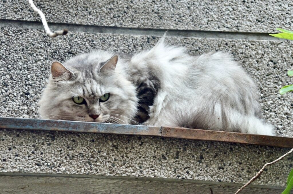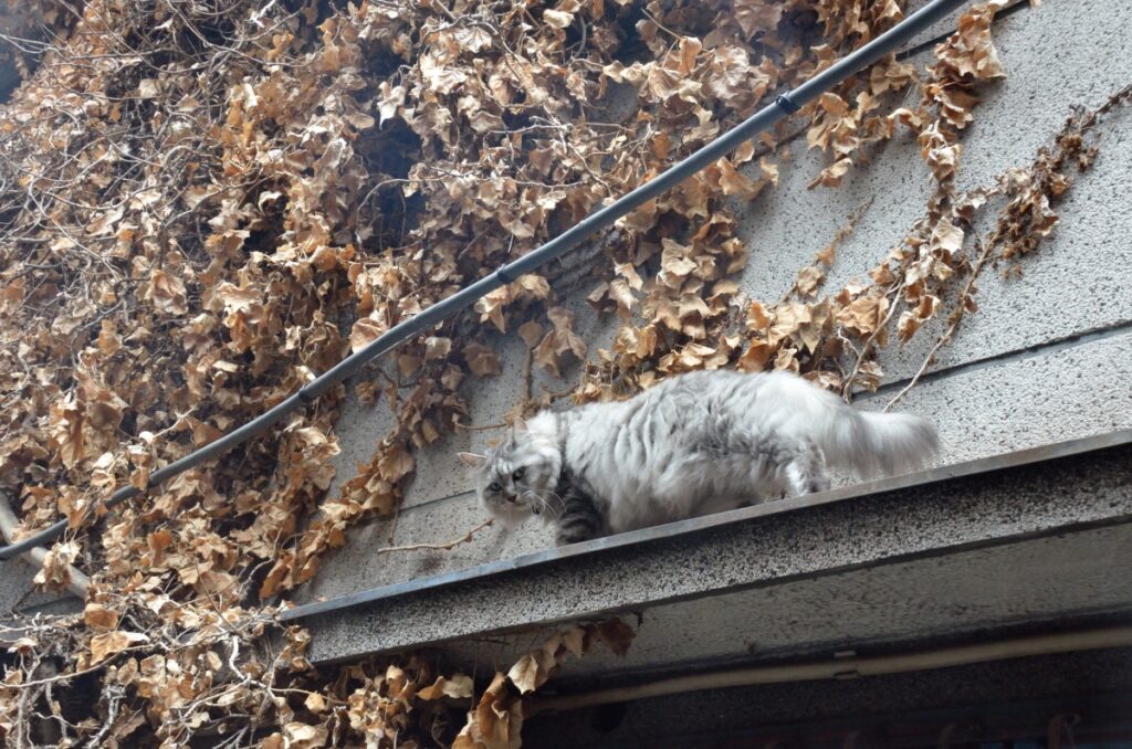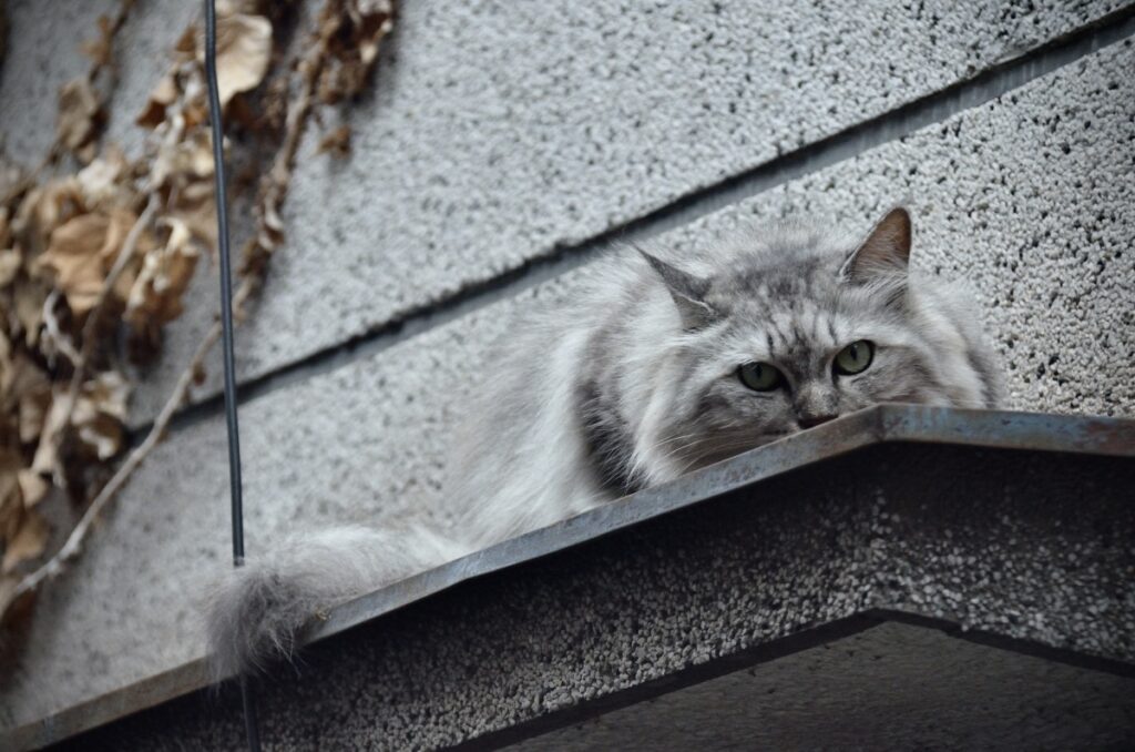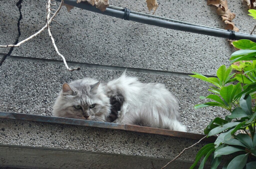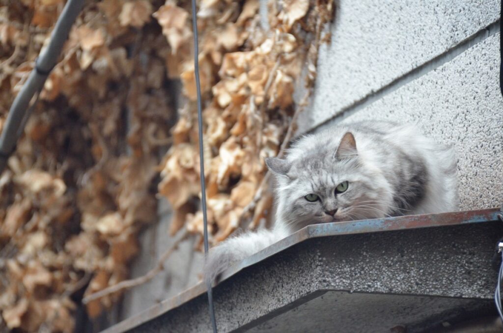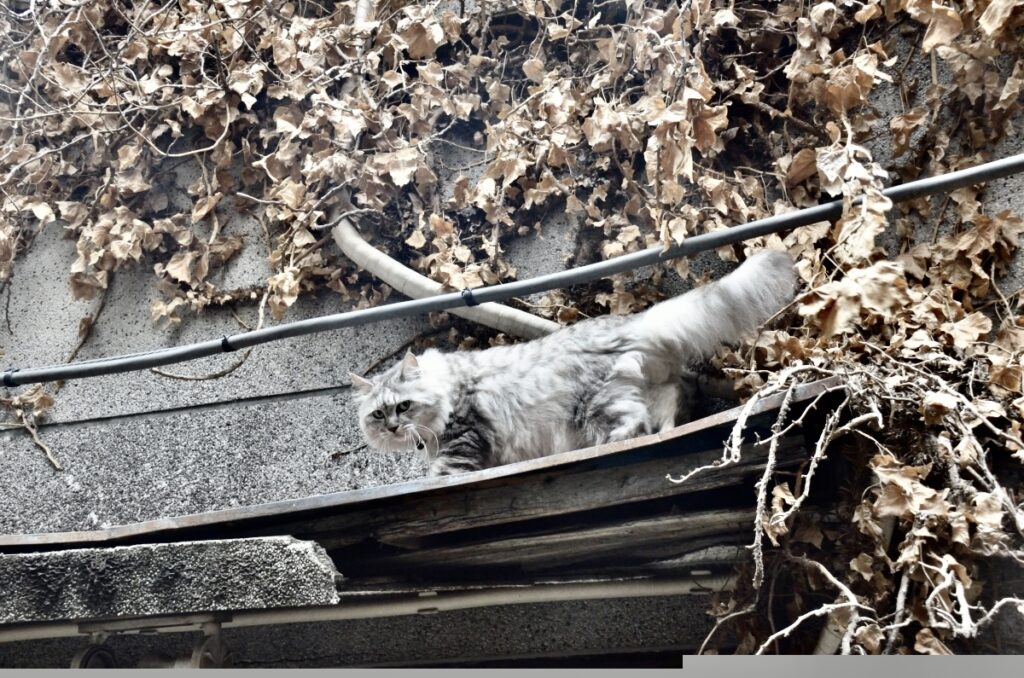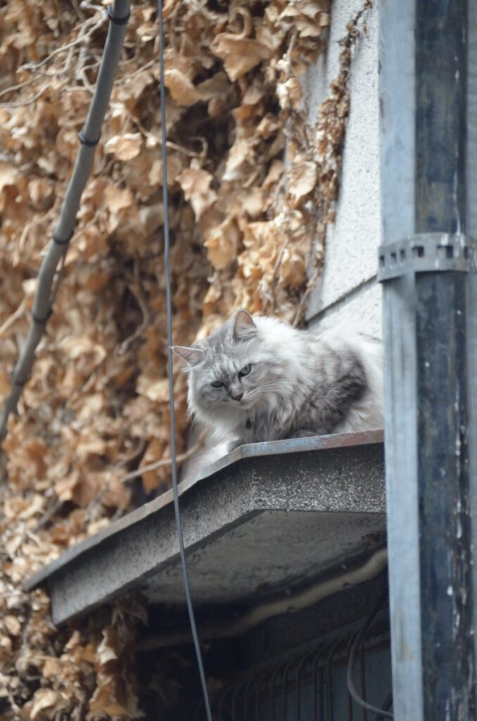 秋が深まり、冬が来ようとしていた。都電荒川線の終点で降り、商店街をぶらついていると、ふと視線を感じた。見上げると、古びた建物の高台、ざらついた灰色のコンクリートの縁に、一匹の猫が鎮座していた。灰色がかった銀色の毛を持つ、長毛種の猫だった。毛並みは全体的にふわふわとしていてボリュームがあり、特に胴体から尻尾にかけての毛は長く、豊かな銀灰色の長毛をまとった王者のように見える。建物は晩秋を示すかのように、乾いた黄土色と茶色の枯れ蔦が壁を覆い、静かで物憂げな空気を醸し出していた。左から垂れ下がる無機質な黒いケーブルと、右側の金属柱が都会の冷たさを強調する中、その猫は微動だにしない。緑がかった色をした目はわずかに細められ、下界の喧騒や人間の営みに対して、全てを見透かしたかのような、達観しつつもかすかに不機嫌そうな視線を送っていた。毛皮の温かさとは裏腹に、その表情には静かな孤立と高い警戒心が宿っている。彼はこの古びた一角の静かな支配者として、己の縄張りを厳しく監視しているのだ。孤独な使命感にも似ていた。彼はじっと固く座りこみ、来るべき一瞬の動きに備えながら、己の領域の静謐さを守り続けている。私は立ち止まり、彼を見上げた。冷たい壁の上で、あの銀灰色の毛皮をまとった猫は石像のように動かない。緑色の瞳と私の目が、しばし静止した時間の中で交差する。猫は私が立ち止まり見上げていることに即座に気づいたようだ。彼の目は一瞬、警戒の鋭さを増し、耳がわずかにピクリと動いた。