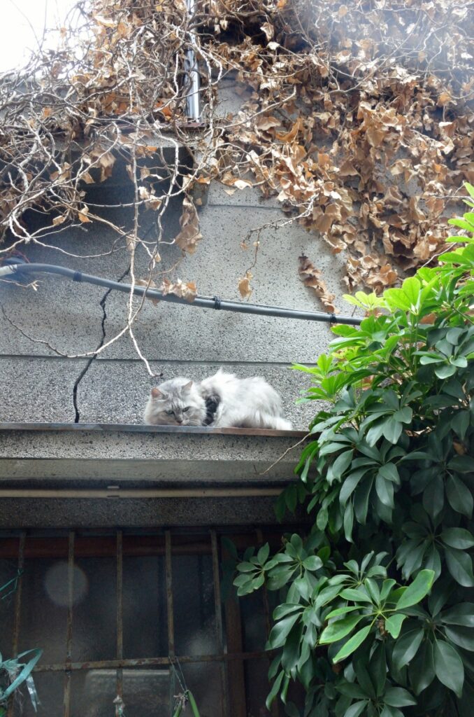 小さな声だった。ただの挨拶。攻撃的な意図がないことを伝える、静かな音の符牒である。猫はすぐには応えない。ただ、その豊かな顔周りの毛に囲まれた口元が、わずかに引き結ばれたままだ。彼は私を、何ら危険のない、しかし退屈な存在として分類し直しているようであった。私は、彼が座る高台と、その背後の枯れた蔦の壁を見上げる。