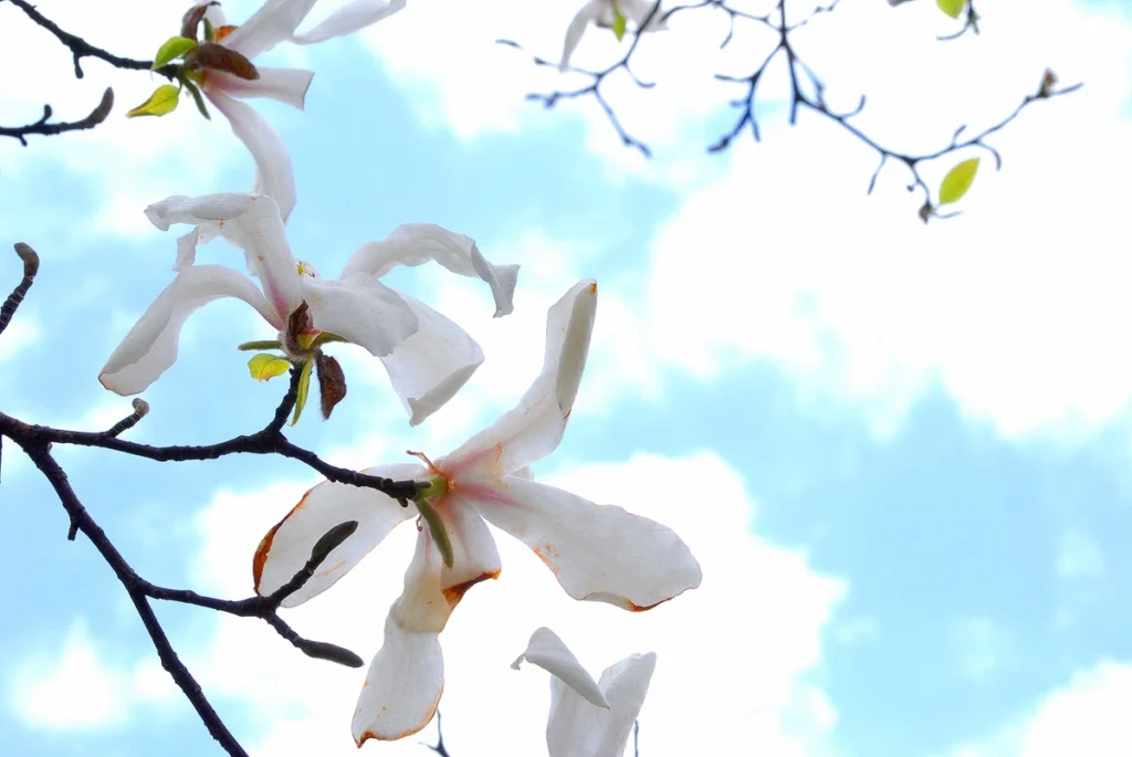 白木蓮の白い花、春の空に映える。柔らかな光を浴びて、静かに開く。冬の寒さを忘れさせてくれる、優しい春の訪れを告げる花。風に揺れる白い花びら、もうすぐ散ってしまうけれど、その美しさは心に残る。白木蓮の花、春のひとときをありがとう。