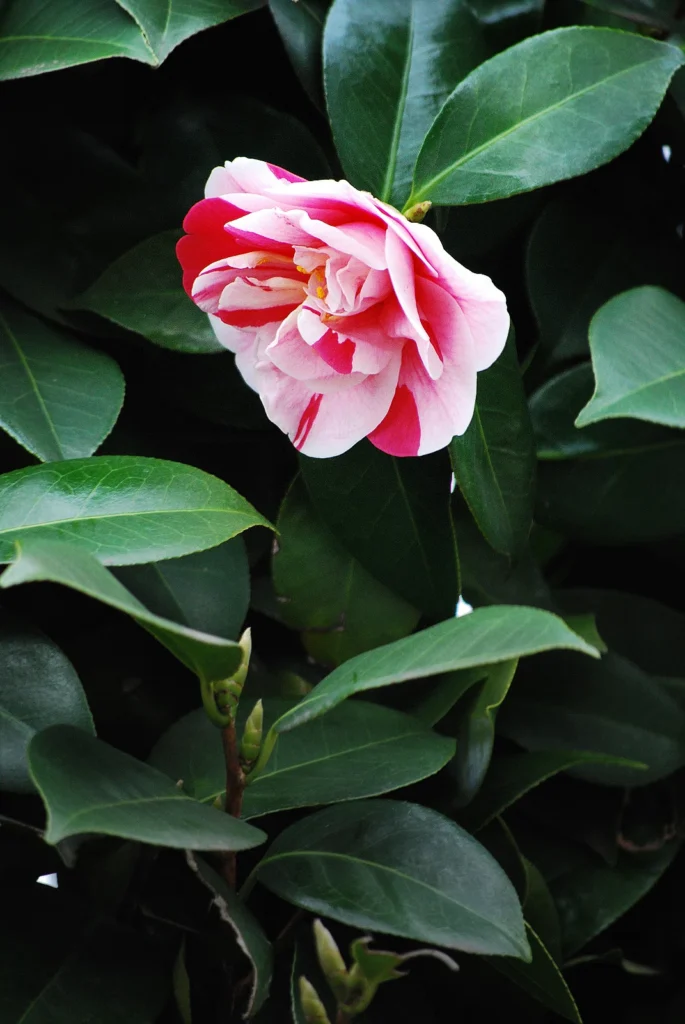 深い緑の淵より、淡桃色の花びら浮かび、白は囁き、黄金の蕊は希望を宿す。春の訪れ告げる、儚き椿、その姿は静かに語りかける。花びらは薄紅の絹、風に揺らめば、緑の葉の額縁に彩られ、優しき光を放つ。舞姫の如く、椿は揺蕩い、しとやかに、凛と咲く。その存在は慰め、温もりを胸に届ける。自然の輝き、その脆さは生の尊さを映し出し、この世界に息づく美しさ、慈しむ心を呼び覚ます。椿の美しさは時を超え、喜びと希望を胸に刻む。その姿は、自然への畏敬の念を深め、世界の美しさに感謝を捧げさせる。私たちは椿の美しさに触れ、静かに、深く、感動を覚える。