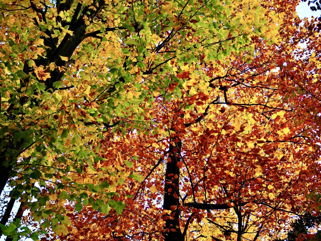 さて、そろそろ帰ろう。代々木公園の空を見上げれば、カエデの葉が壮大な色彩のパレットを広げている。左側にはまだ残る緑が、過ぎ去る夏の名残を惜しむように輝く。右側は燃えるような赤と橙に染まり、秋の情熱を激しく表現する。枝々は黒い血管のように張り巡らされ、生命の力強い構造を示す。透過する太陽の光が、葉の一枚一枚をステンドグラスのように透過させる。生命の色が織りなす万華鏡。木々は沈黙の画家となり、天空いっぱいに傑作を描き上げていた。