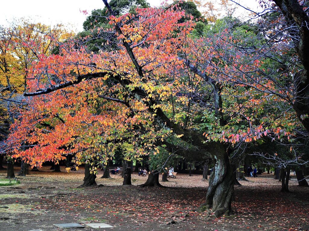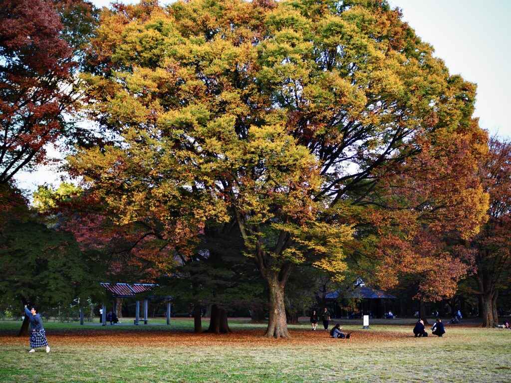 燃えるような緋色と橙色に染まり、晩秋の華やかさをまとう。木の幹は幾重にも曲がりくねり、長きにわたる時の流れと生命の軌跡を刻んでいる。散り敷かれた赤褐色の葉が、地面に秋の深まりを映し出す絨毯を織りなす。代々木公園の広場は穏やかに広がり、遠くには静かに憩う人々の姿が見える。この一本の木が、春夏秋冬の記憶を宿しているかのようだ。色彩の中に現れる喜びと寂寥。風が吹けば、葉は舞い、別れを告げるような乾いた音が響く。生命の燃焼と休息が、晩秋の風景に静かに同居している。過ぎゆく季節の美しさが余韻を残す。