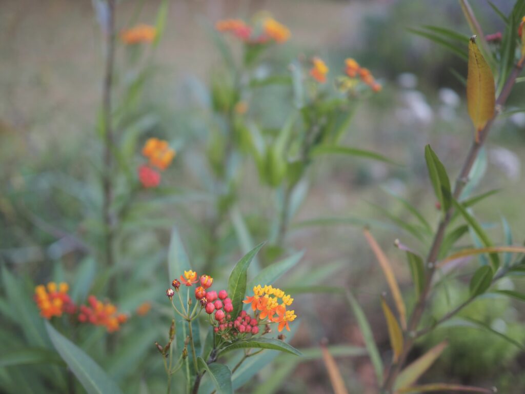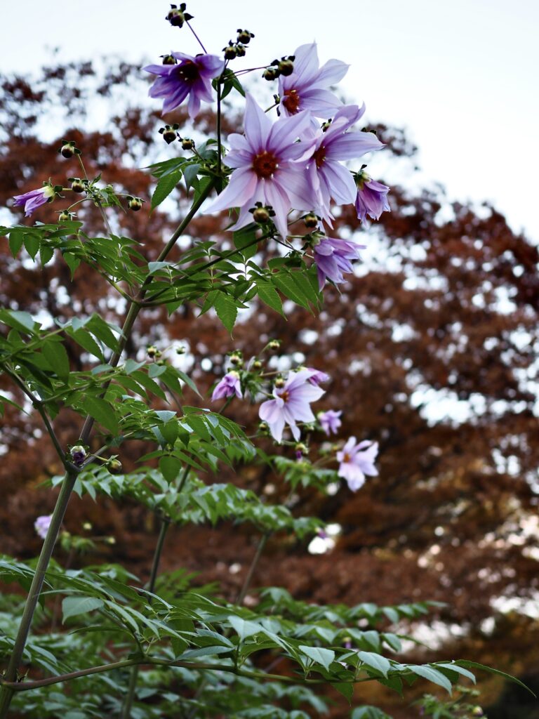 天を突くように伸びたダリアの茎が、晩秋の空へ。淡い薄紫色の花びらは、繊細な光を捉えて静かに咲き開く。背後には、ケヤキなどの樹々が、朽葉色の濃密な絨毯を広げている。温かい褐色と冷たい紫の対比が、季節の深まりをしやかに演出する。高い位置で咲く花は、地上を離れた孤高の美を体現している。緑の葉と未開の蕾が、まだ残された生命力と希望を感じさせる。秋の静けさ。花が持つ強い意志。移ろう季節の中で、一輪の花。