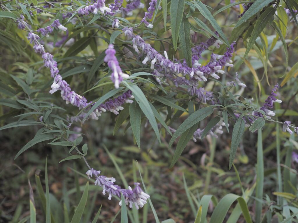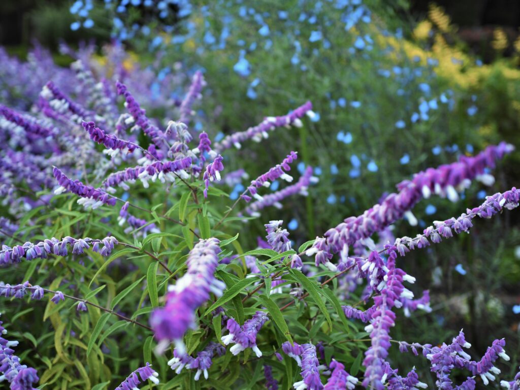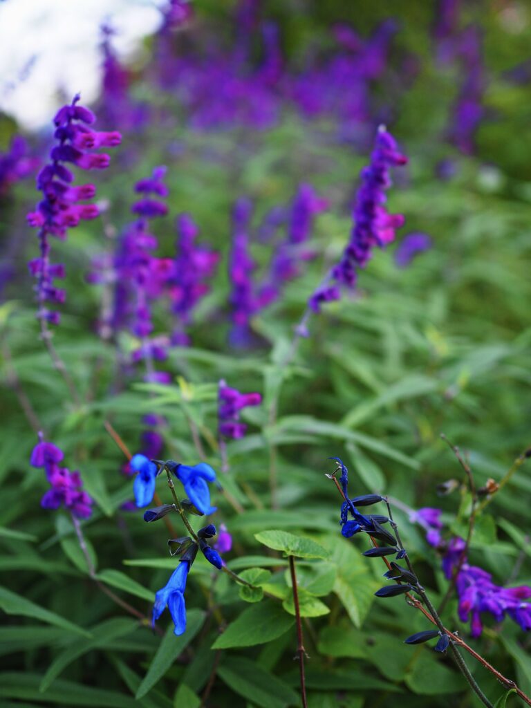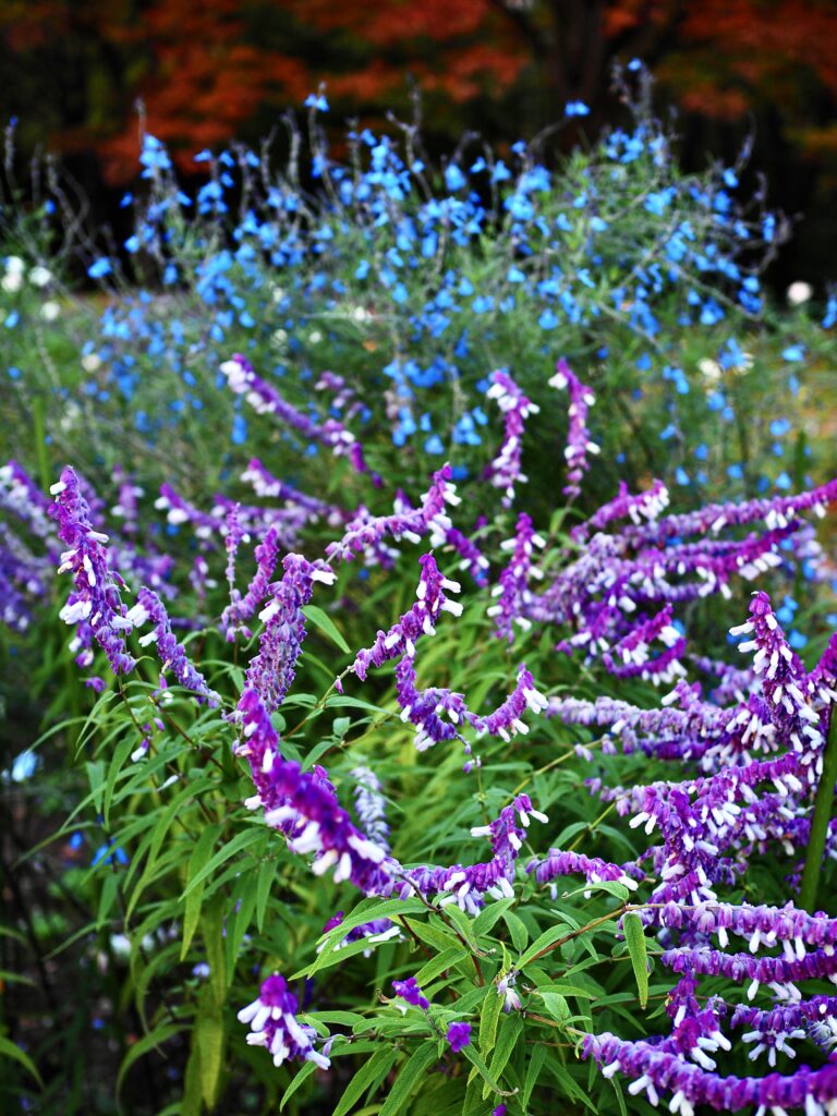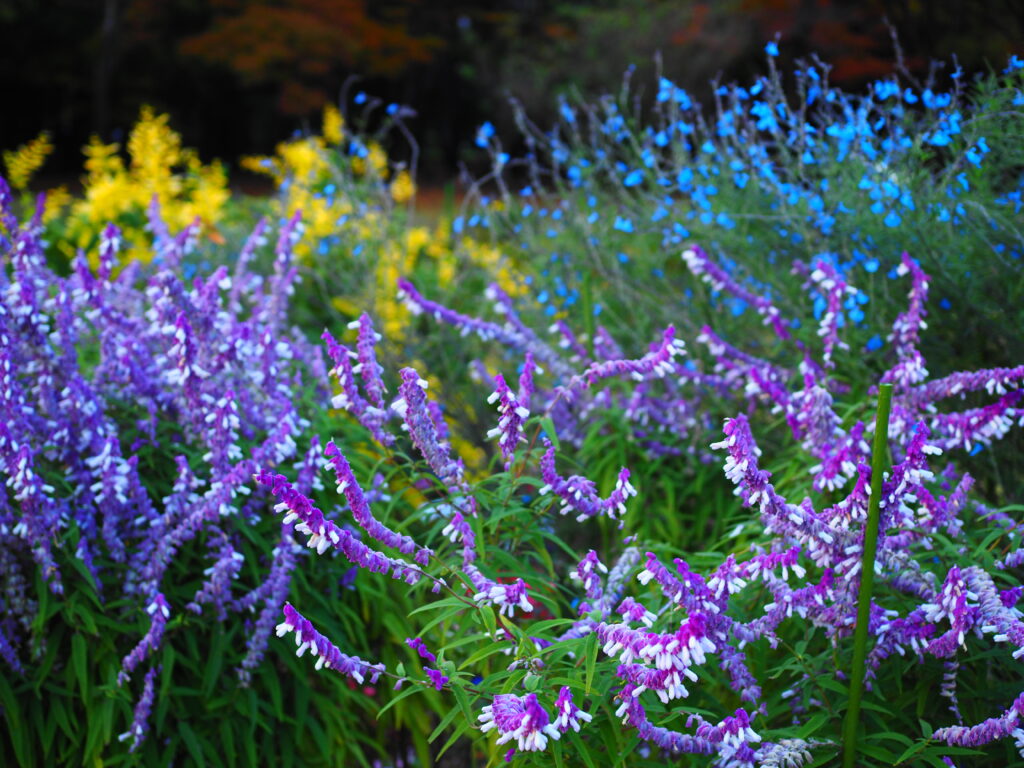 代々木公園に咲く紫と白の競演。アメジストセージ(サルビア・レウカンサ)が光と影をまとい、公園の主役として優美に揺れる。背後には黄金色の光が差し込み、おそらくソリダゴ(アキノキリンソウ属)などの黄色い花々が夢幻的な背景を織りなす。はるか彼方には澄んだ空の色を映した青い花々、これは細い花穂を持つサルビア・ウリギノーサ(ブルーサルビアの一種)かキャッツテールセージなどが静かに天を仰ぐ。鮮やかな色彩のコントラストが、生命の躍動を詩的に描き出す。紅葉は舞台を支える脇役として、色とりどりの花々を引き立てる。風にそよぐ花の姿は、無言の対話を交わしているかのようだ。一瞬の光景の中に、永遠にも似た美しさが凝縮されている。紫の賢さと青の知恵が、黄色の希望と調和して咲き誇る。色彩は、見る者の心に深い安らぎと感動をもたらす。自然が奏でる色彩のシンフォニーが、穏やかな黄昏のひとときを満たす。