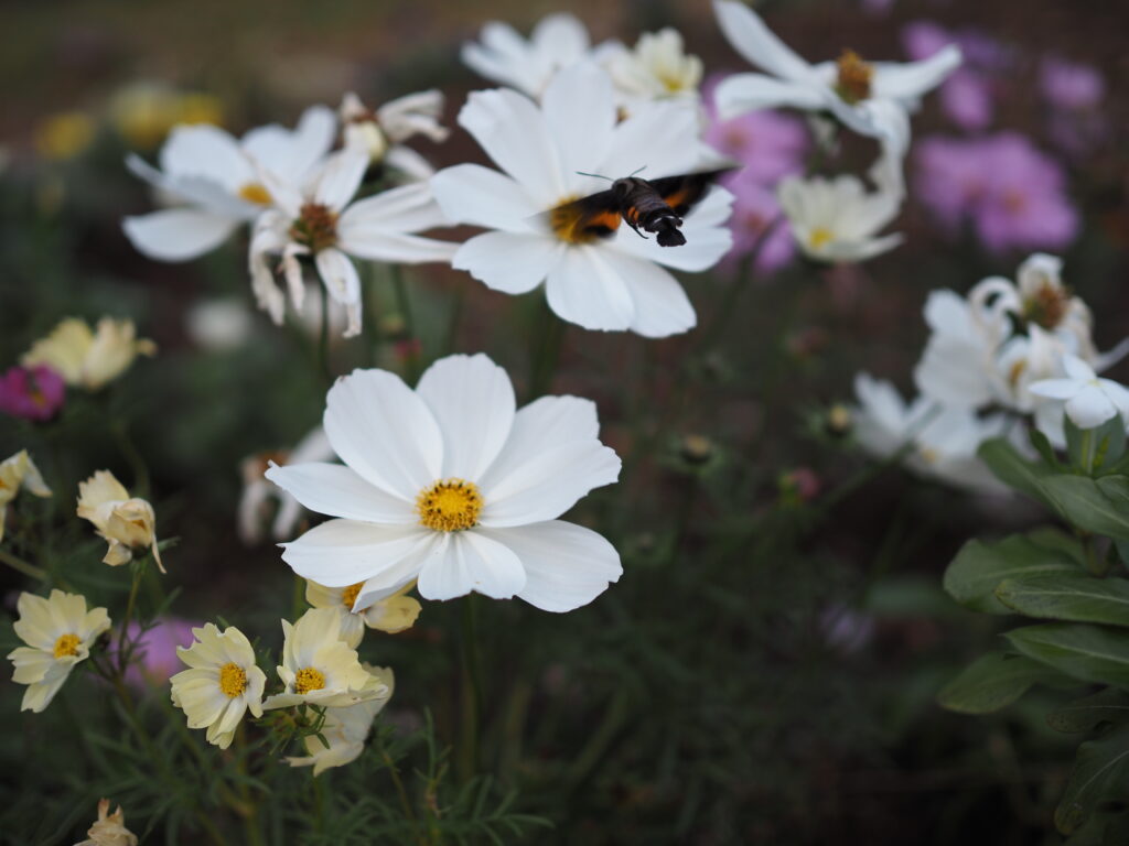 白いコスモスの群れが、宵闇に浮かぶ星のように咲き乱れる。ハチドリに似たホシホウジャクが、瞬間の静止を破りホバリングする。宙に留まる小さな命は、蜜を求めて懸命に舞う精霊のようだ。背景には、枯れゆく花びらさえもが、秋の終わりのはかない美しさ。深まる闇の中。白き花々は一際明るく輝きを増す。