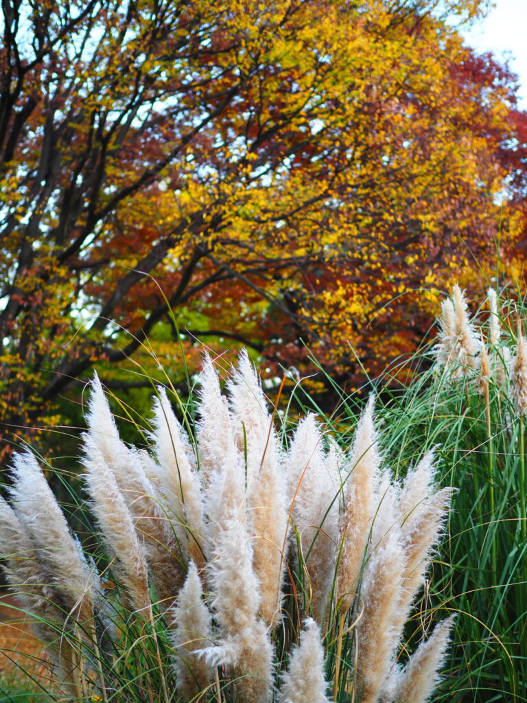 秋の陽を浴びて、パンパスグラスの穂が白銀の絨毯のように輝く。風に揺れる柔らかな穂は、季節の移ろいをささやくかのようだ。背後には、燃えるような紅葉。黄金色に染まった葉は、天空の炎のように景色を照らし出す。深い緑の葉と、枯れいく草が、時の流れを静かに物語る。白と橙の鮮やかなコントラストが、生命の終焉と新たな美を同時に描く。垂直に伸びる穂は、大地から天への祈りにも似た姿。穏やかな光の中、自然の雄大さと繊細さが交錯する。