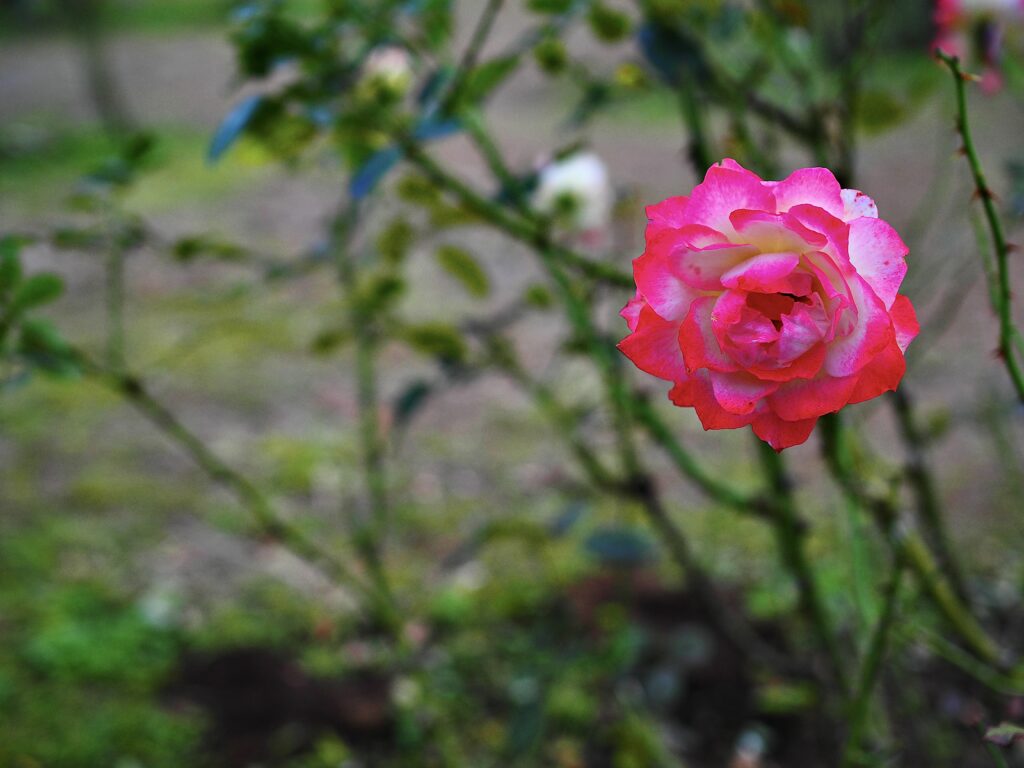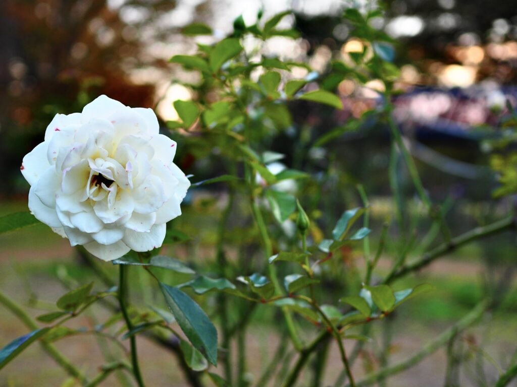 日が傾き周囲が薄闇に包まれる頃、純白の薔薇がひっそりと代々木公園の暗がりの中にその姿を際立たせる。背景の木々は残光を映し、ぼかしの中に柔らかな光の玉を浮かべていた。その白い花びらは初雪のように静かで、近づく寒さをそっと受け入れているようだ。葉の緑は深い影をまといはじめ、清らかな白さが一層際立つ。時が止まったかのような静寂の中、この一輪の花だけが澄んだ息吹を放っていた。