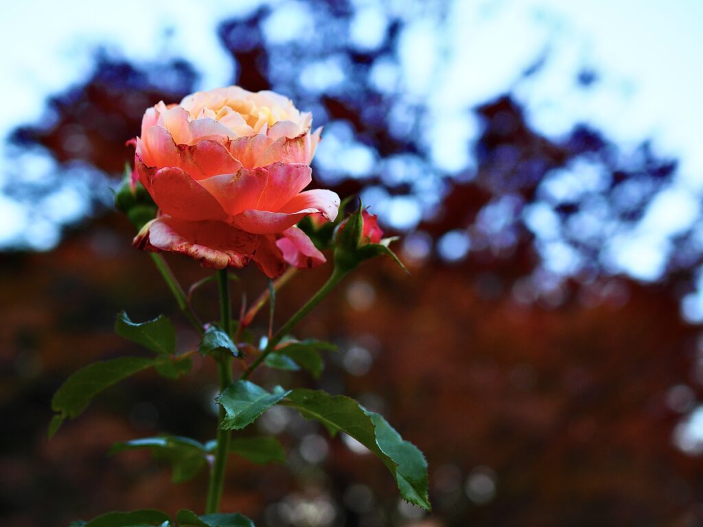薄れていく光の中で、一輪の薔薇がアプリコットと紅の色を混ぜたように優しく輝く。花びらの縁には晩秋の冷気が触れ、ほのかな赤みを増しているように見えた。背後の木々は深い茶色に沈み、上部の青空とのコントラストが幻想的な情景を作りだす。小さなつぼみたちは、名残の美しさを守るかのように、寄り添って静かに時を待つ。命の盛りを過ぎてもなお、この花が持つ優雅な姿は見る者の心に訴えかける。静寂と色彩が織りなす、黄昏時の秘められた物語。