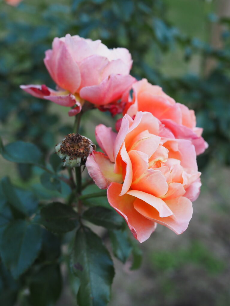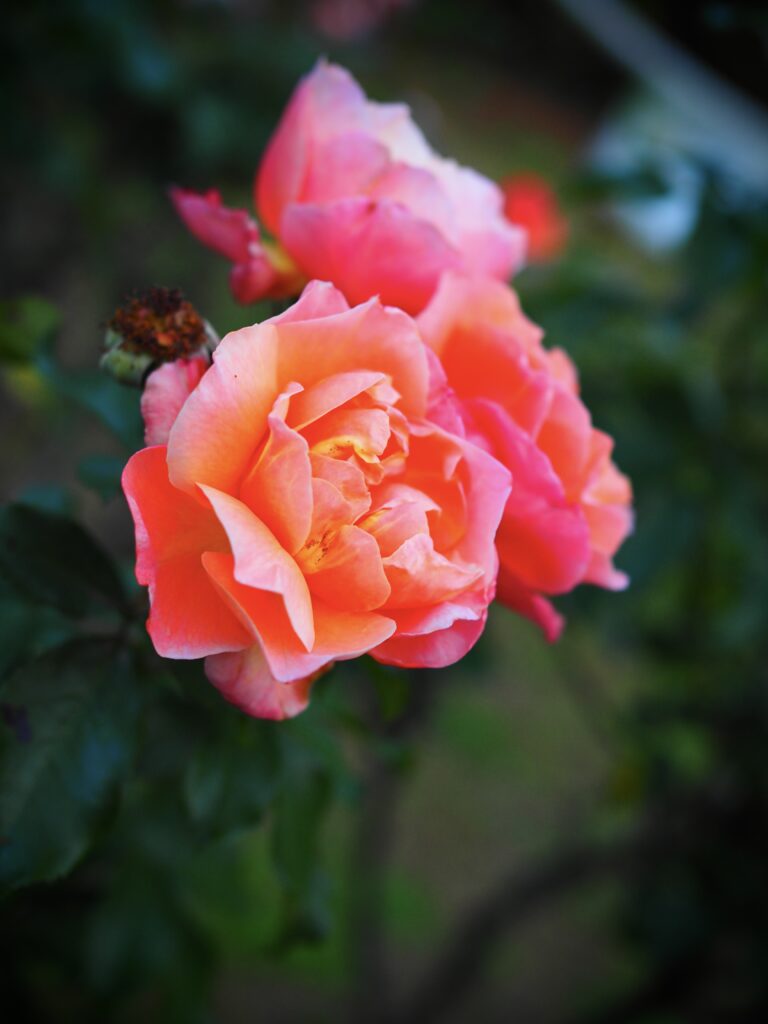 一日の終わりに近づく光を浴びて、薔薇はアプリコットと鮮やかなピンクの深い色合いを湛えている。濃い緑の葉の中に浮かぶその姿は、秘密の情熱を秘めた宝石のようだ。花弁の層には、過ぎゆく季節の切なさと、たゆまぬ生命の輝きが同時に見えた。周囲の闇が深まるにつれ、柔らかな色彩はかえって強く心を捉える。黄昏時、静かに咲き続けるこの花は、代々木公園に訪れた、短い秋の夢の残像のようだった。