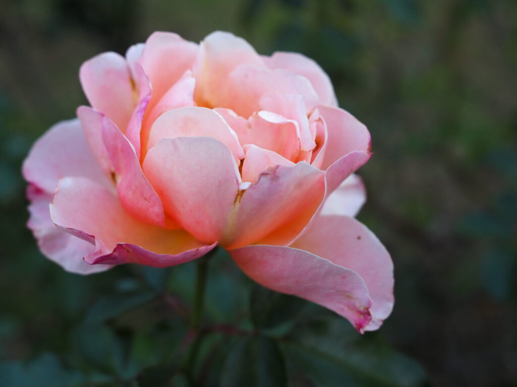 黄昏時、大輪の薔薇が薄いアプリコットピンクの色彩を惜しむように広げている。花弁の縁はかすかに濃いピンクに染まり、過ぎゆく一日の名残の光を捉えていた。奥深い層には、光と影が織りなす繊細な陰影が静かに息づいている。背景の緑は深く沈み、花の柔らかな輝きを際立たせる舞台となる。秋の冷気が優しく薔薇を包みこむ。やがて来る夜への静かな祈りのように、はかなくも力強い美しさだった。