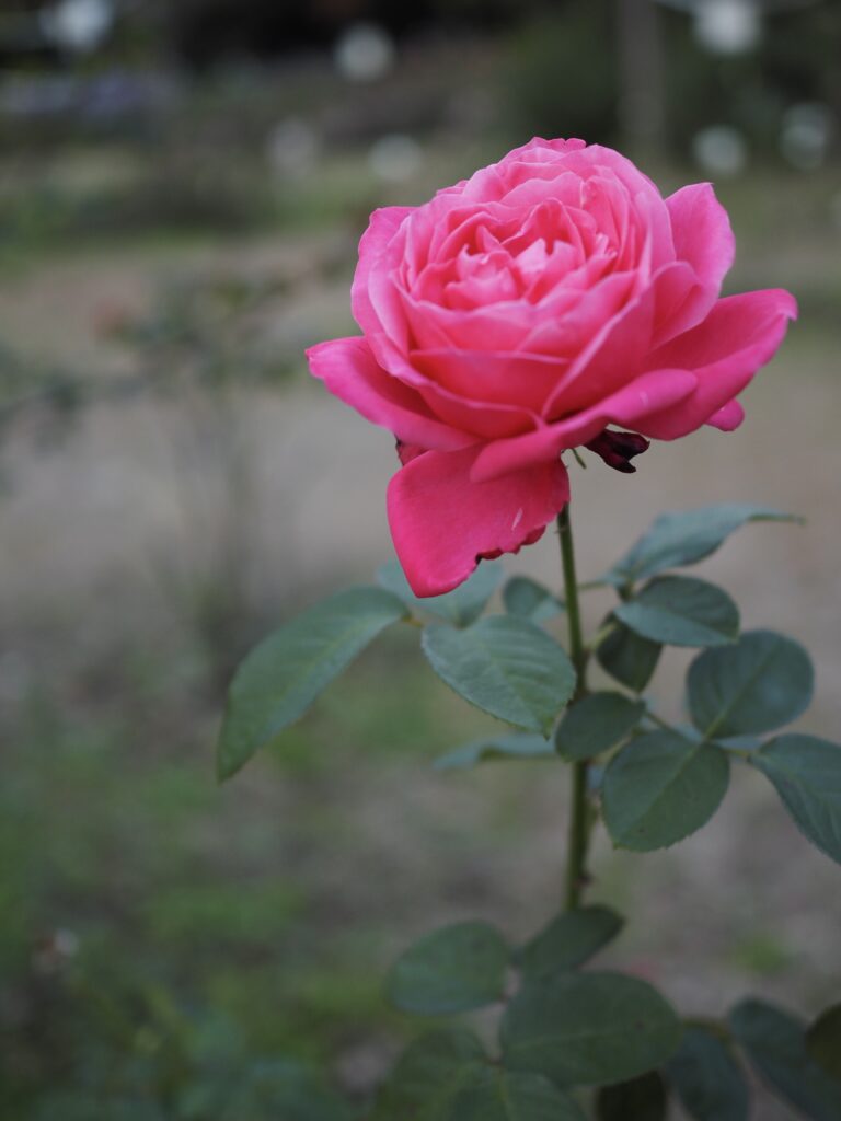 代々木公園の黄昏の帳が降りる中、一輪の鮮烈なマゼンタ色の薔薇が、背景の薄闇に負けずに立ち昇る。深く巻いた花弁は、一日の終わりの光を一点に集め、熱を帯びた輝きを放っている。周囲の土と枯れかけた緑は静かに沈み、花を際立たせる舞台のようだった。短い秋の日に、情熱を絶やさぬ薔薇の姿は、季節の寂寥に対する力強い抗いのようだ。背筋を伸ばし立つその様子は、孤高の美しさを秘めた詩的な存在感を持つ。冷たい空気の中で、ただひたすらに咲き続けるその姿。心を動かされる。