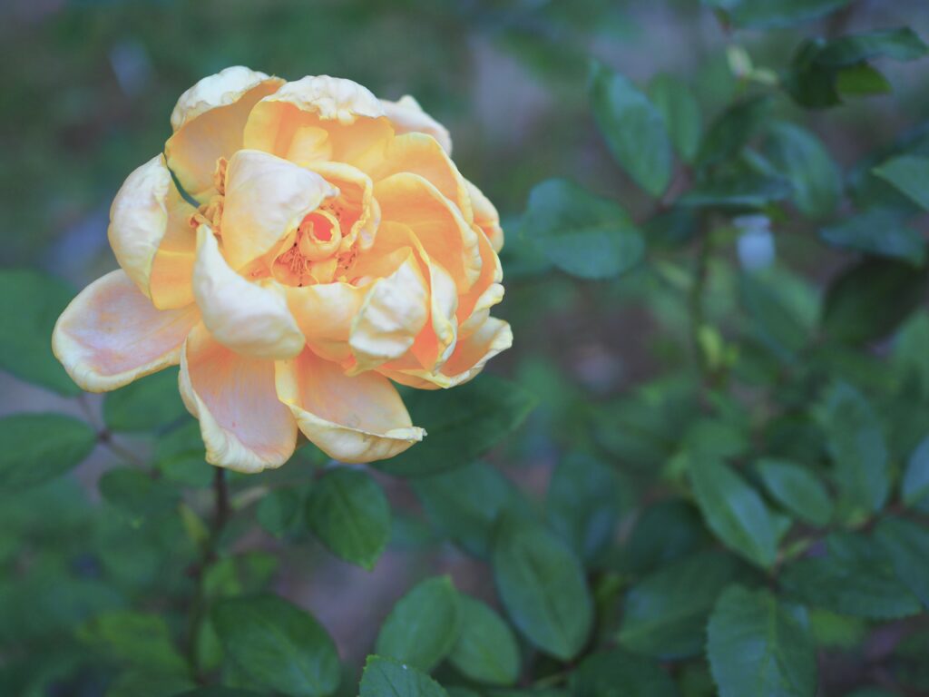 黄昏の空の下、一輪の淡い黄金色の薔薇が、周囲の濃い緑の中で静かに。花弁の縁には薄いピンクが滲み、日没の光を受けて優しい色調を湛えて。深く巻いた花芯には、過ぎゆく季節の温もりが凝縮されているかのように。葉の深い影が、柔らかな光を放つ花を、宝物のようにそっと抱えている。短い秋の日の最後の美しさを惜しみ、薔薇は静かに時を刻んでいる。その姿は、過ぎ去る喜びと、満ち足りた静寂を伝える詩情に溢れていた。