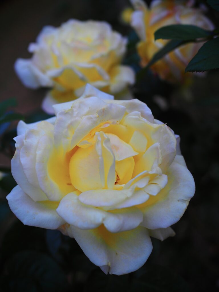 黄昏時、暗さを増す代々木公園に、クリーム色の薔薇が淡い光を宿したように浮かび上がる。外側の花弁は白く、中心に向かうほど柔らかなレモンイエローの輝きを秘めていた。背後の花はぼやけた光輪となり、手前の主役の優雅さを引き立てている。深い闇が忍び寄る中で、淡い花は小さな月のように静かに輝きを放つ。短い秋の日が終わりを告げる頃、清らかな美しさは、心に温かい灯をともすようだった。