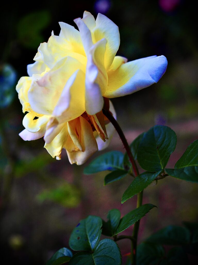 黄昏時の光を浴びて、一輪の黄色い薔薇が最後の輝きを放ちながら斜めに傾いている。花弁の先端には神秘的な青白い影が落ち、闇に沈む背景とのコントラストを際立たせる。舞台のスポットライトを浴びる孤独な舞踏家のように。細い茎と深い緑の葉は、はかない美しさを支える力強さを内に秘めている。短い秋の夜が訪れる直前、薔薇は燃えるような色彩と冷たい影を同時に見せていた。情熱と寂寥が混じりあう、黄昏の刹那的な詩であるかのように。
