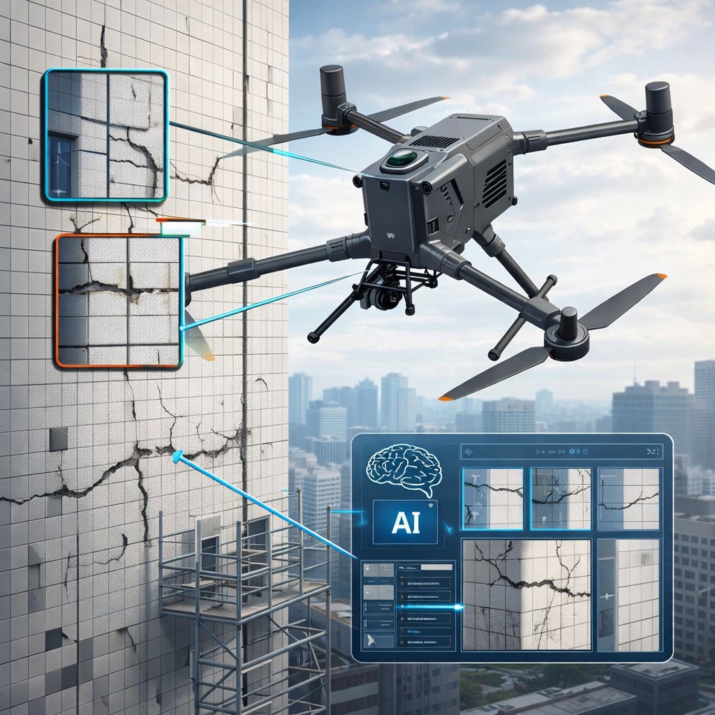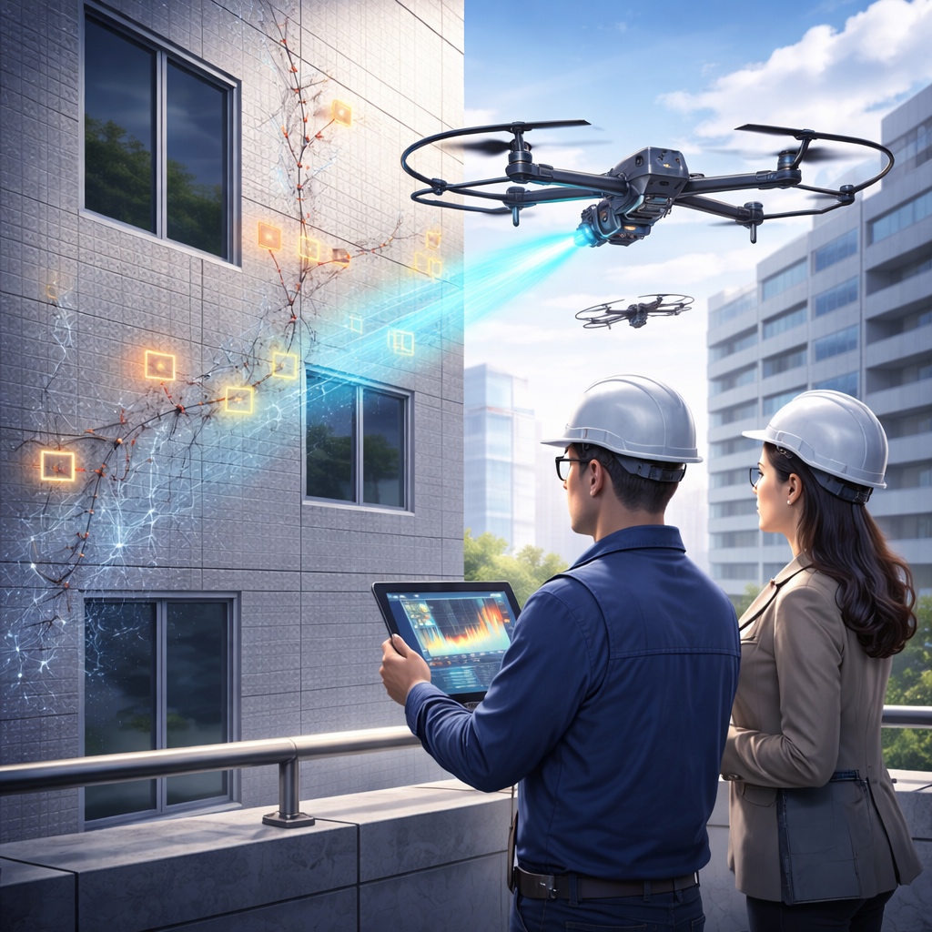 建物の外壁は、経年劣化によってひび割れや浮き、含水といったさまざまな損傷が生じます。これらを放置すると外壁材の落下や雨水の浸入につながり、建物の資産価値が下がるだけでなく、居住者や通行人への安全上のリスクにも発展しかねません。こうした背景から、建築基準法第12条では一定規模以上の建物に対して定期的な調査と報告が義務付けられています。いわゆる「12条点検」と呼ばれるもので、マンションやホテル、商業施設、学校などの所有者・管理者にとっては避けて通れない義務です。これまでその調査の主流は、足場を組んで専門家が目視・打診で確認する方法でした。しかし足場の設置には多大なコストがかかるうえ、高所での作業は常に危険と隣り合わせです。
