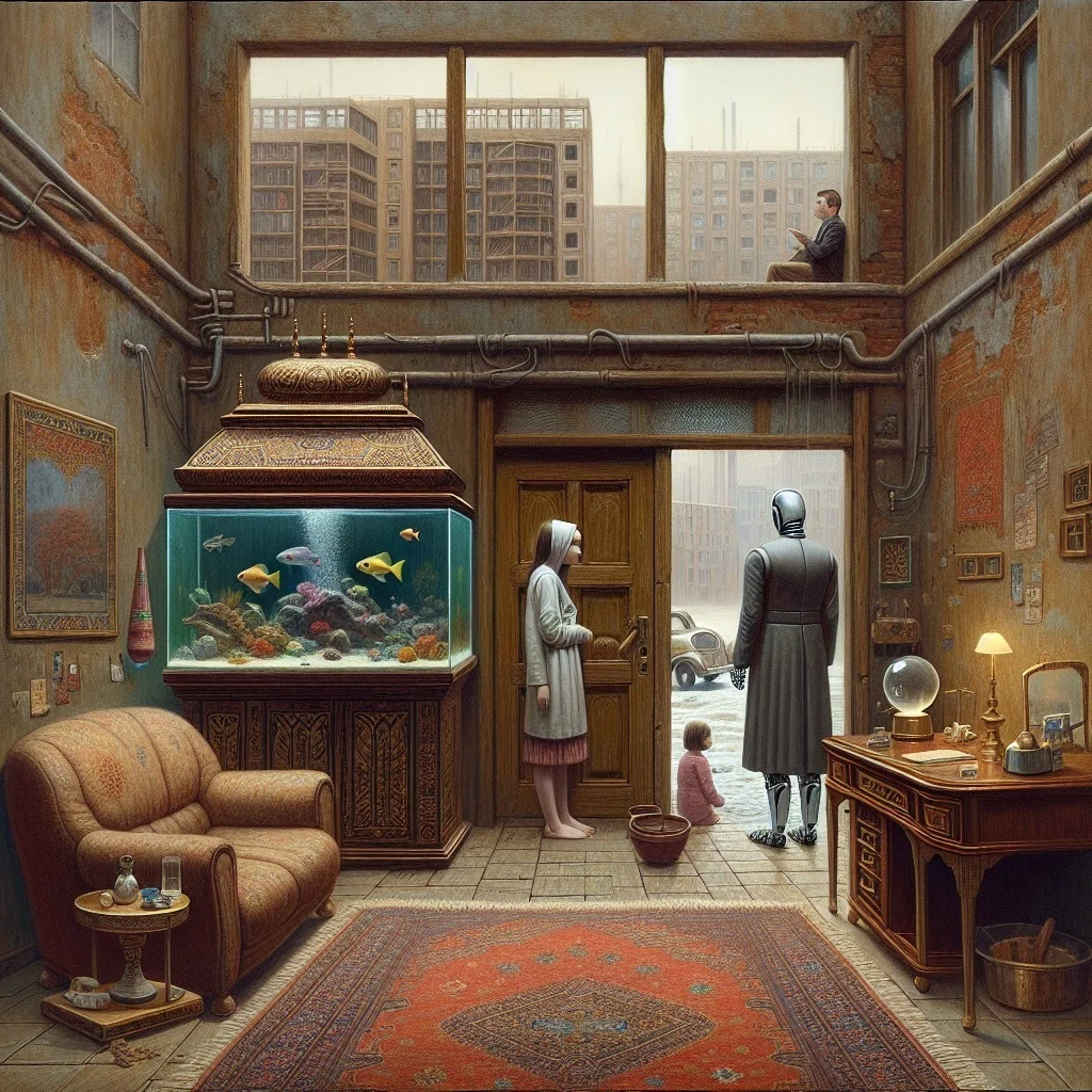 部屋にはペルシア絨毯が敷かれ、光り輝くマホガニーの机があり、熱帯魚が泳ぐ大きな水槽の前で、髪を伸ばした色白の少女が立っていた。