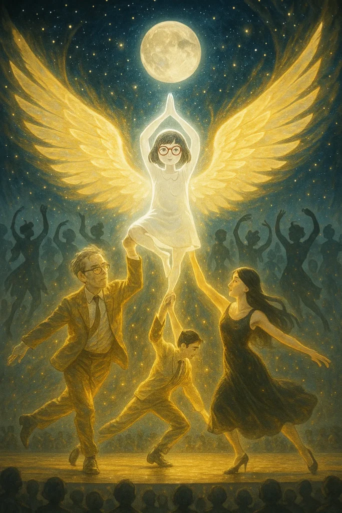 涼子も加わり、3人は完璧な三位一体の動きを見せた。教授と涼子はモヤちゃんの手を取り、息を呑むような高度なリフトを決めた。客席から歓声が上がる。舞台装置が変化し、巨大な光の翼が3人の背後に現れた。周囲の影の民たちも呼応し、舞台全体が生命体のように脈動しはじめた。突如、劇場の天井が開き、満天の星空と巨大な満月が露わになった。実際には最新のプロジェクションマッピング技術だったが、観客はその境界を見分けることができなかった。舞台全体が金色と銀色の光のハーモニーに包まれ、時間が凍結したかのような美しさが広がった。