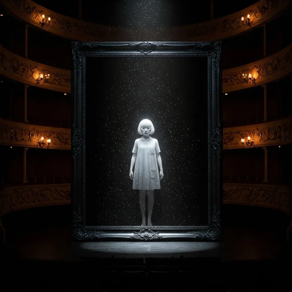 ザワザワザワ!会場がどよめく。ステージ奥の暗闇から鈍い音が響き、ギギギギイィッとなにかがきしむような、重々しい金属音が劇場全体を包みこみ、暗闇がうごめき、ステージの奥の黒い幕がゆっくりと左右に開かれていく。現れたのは、想像を絶するほど巨大な姿見だった。その額縁は黒曜石のように深く艶やかな黒で、複雑な模様が銀で刻まれている。古代遺跡から発掘された魔法の鏡のよう。鏡面は闇夜のように黒く、その闇の中央に、ぼんやりとモヤちゃんの姿が浮かび上がっていた。輪郭は霞んでいて、幽霊のように半透明。闇に溶けこむその姿は、この世のものとは思えないほどはかなげだ。劇場の照明は落とされ、唯一の光源であるスポットライトが姿見を照らし出す。その光は鏡面に反射し、無数の光の粒となって劇場全体に散らばり、幻想的な雰囲気を作り出していた。観客たちは息を殺し、その異様な光景に固唾を呑んで見守っていた。審査委員長が鏡面を指差した。